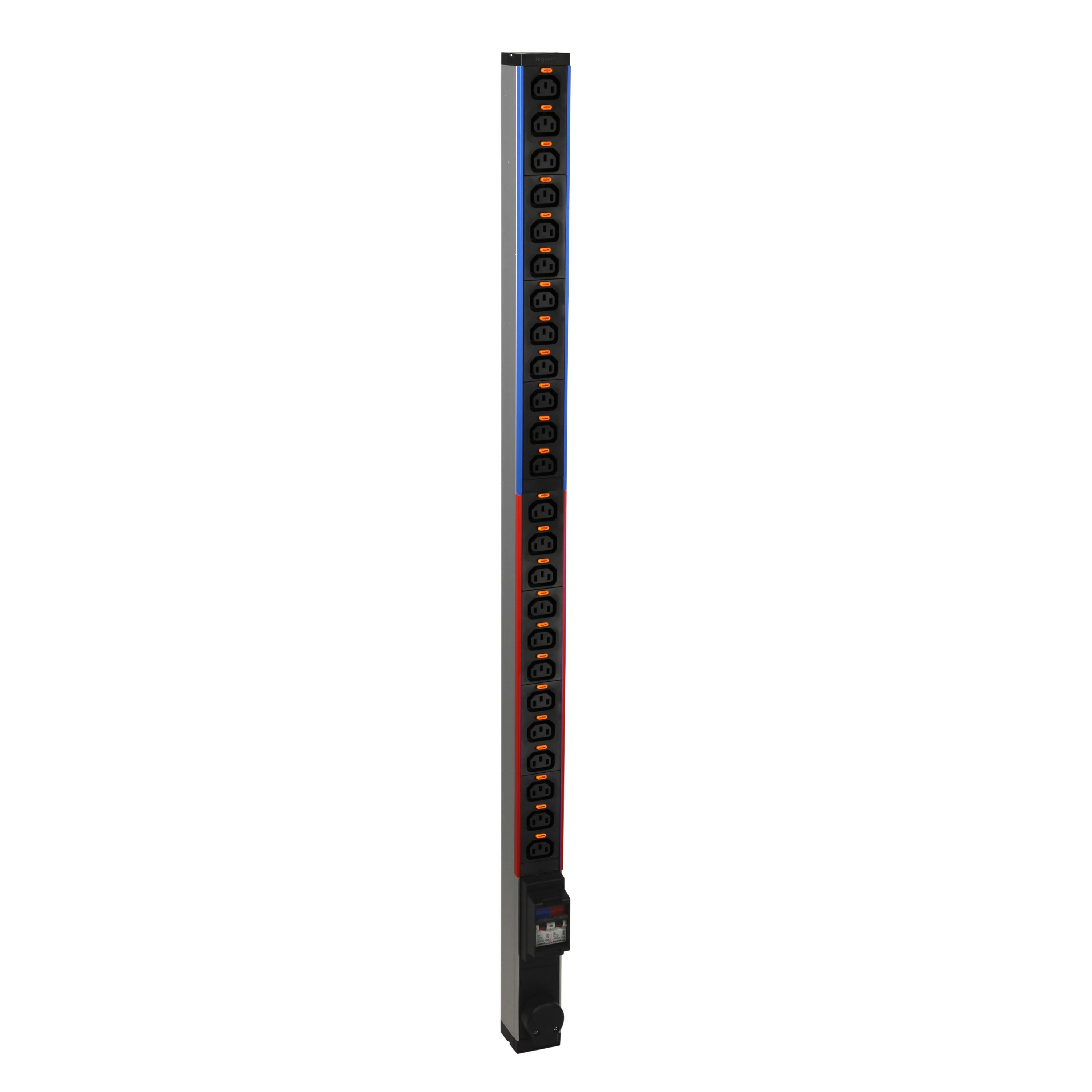 PDU standard monophasé Zéro-U LCS³ Avec 24 prises C13 verrouillables et raccordement par bornier jusqu'à 6mm² Alimentation monophasée 230V - 50Hz - 60Hz -PDU composé de 2 circuits protégés par disjoncteurs uni + neutre 16A installés dans un support débordant pour éviter les coupures accidentelles Chaque circuit est identifié par un repérage couleur - Le nombre total de prises est réparti de façon égale entre les 2 circuits - Prises 2P+T inclinée à 55° avec eclips de protection Sortie de câble rotative à 330° pour une parfaite orientation du cordon d'alimentation - Modules noirs (prises et fonctions) dans cuve aluminium
