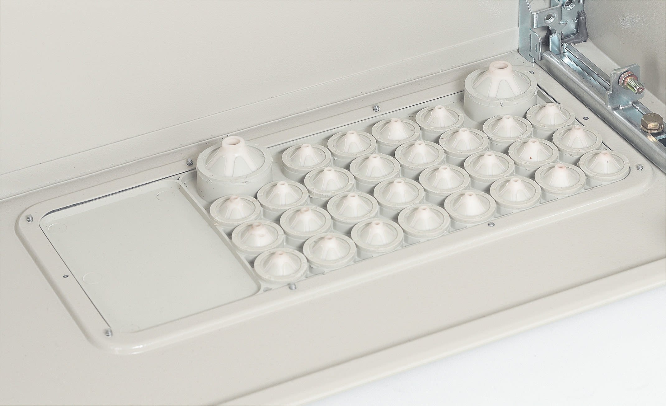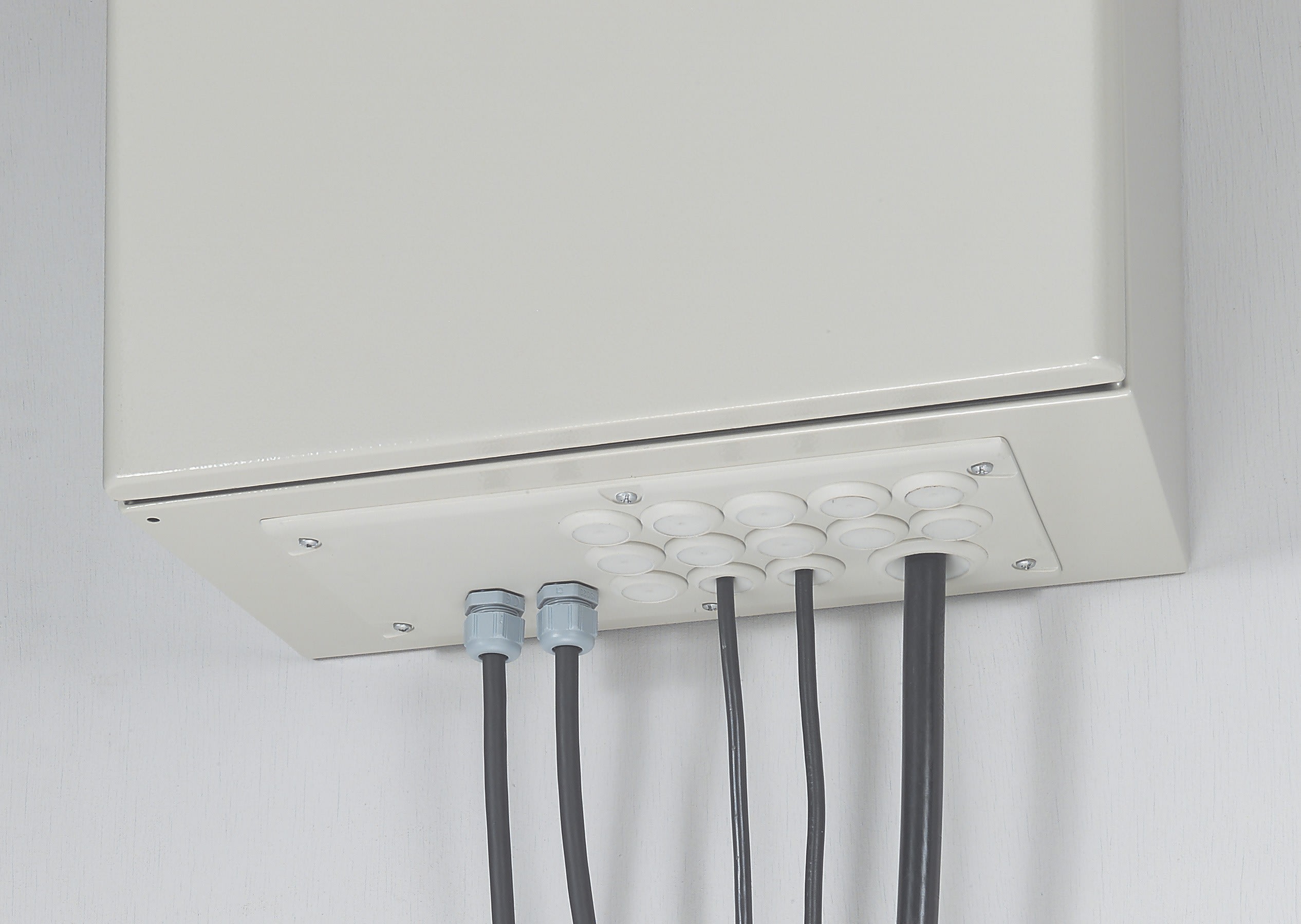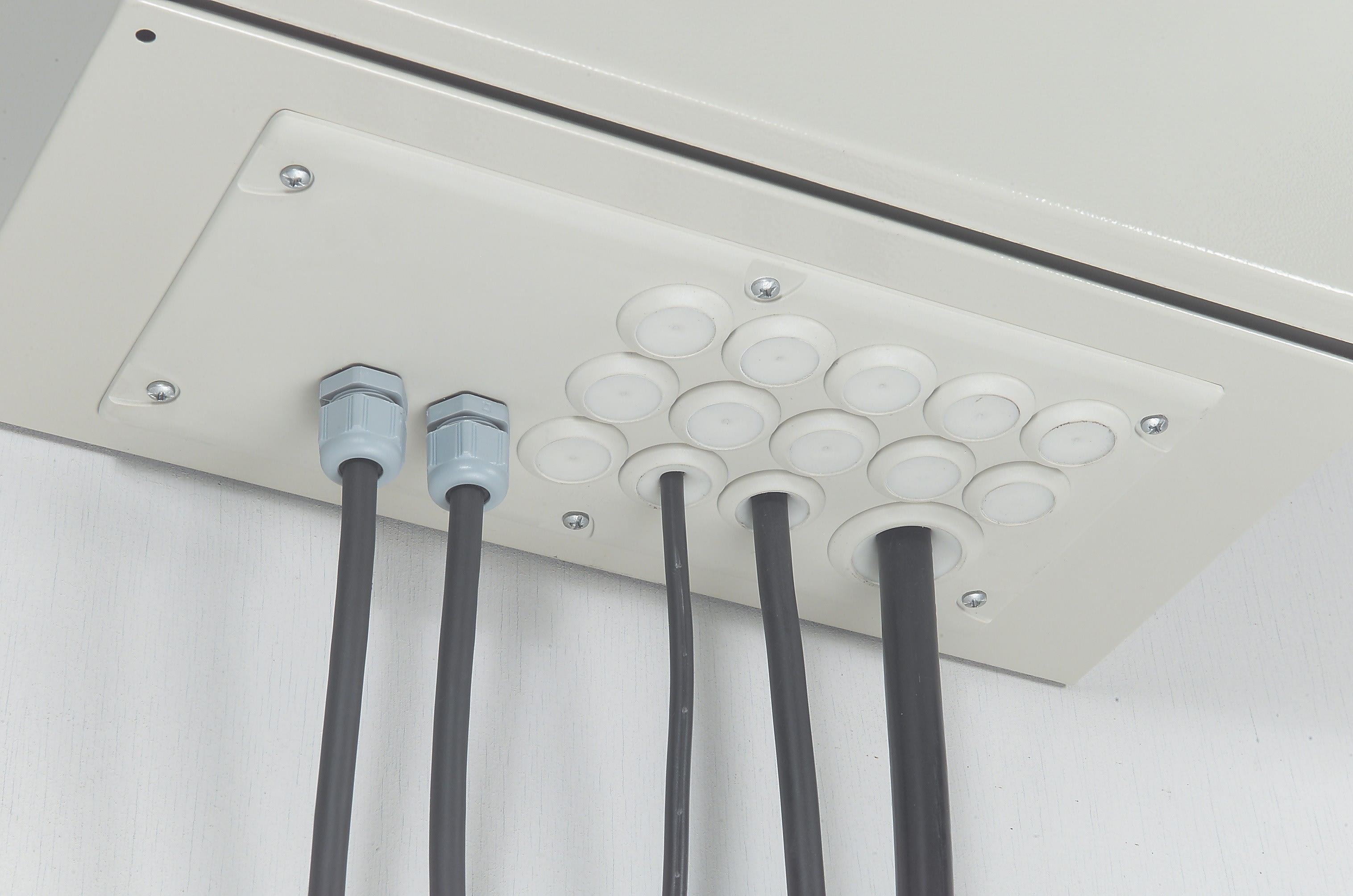 Plaque passe-câbles Cabstop IP55 avec 13 entrées Ø5mm à Ø14mm et 1 entrée Ø14mm à Ø24mm avec 1 réserve et mâchoire serre-câble - livrée avec bouchons de condamnation et outils de débrayage du câble - perforable directement avec le câble