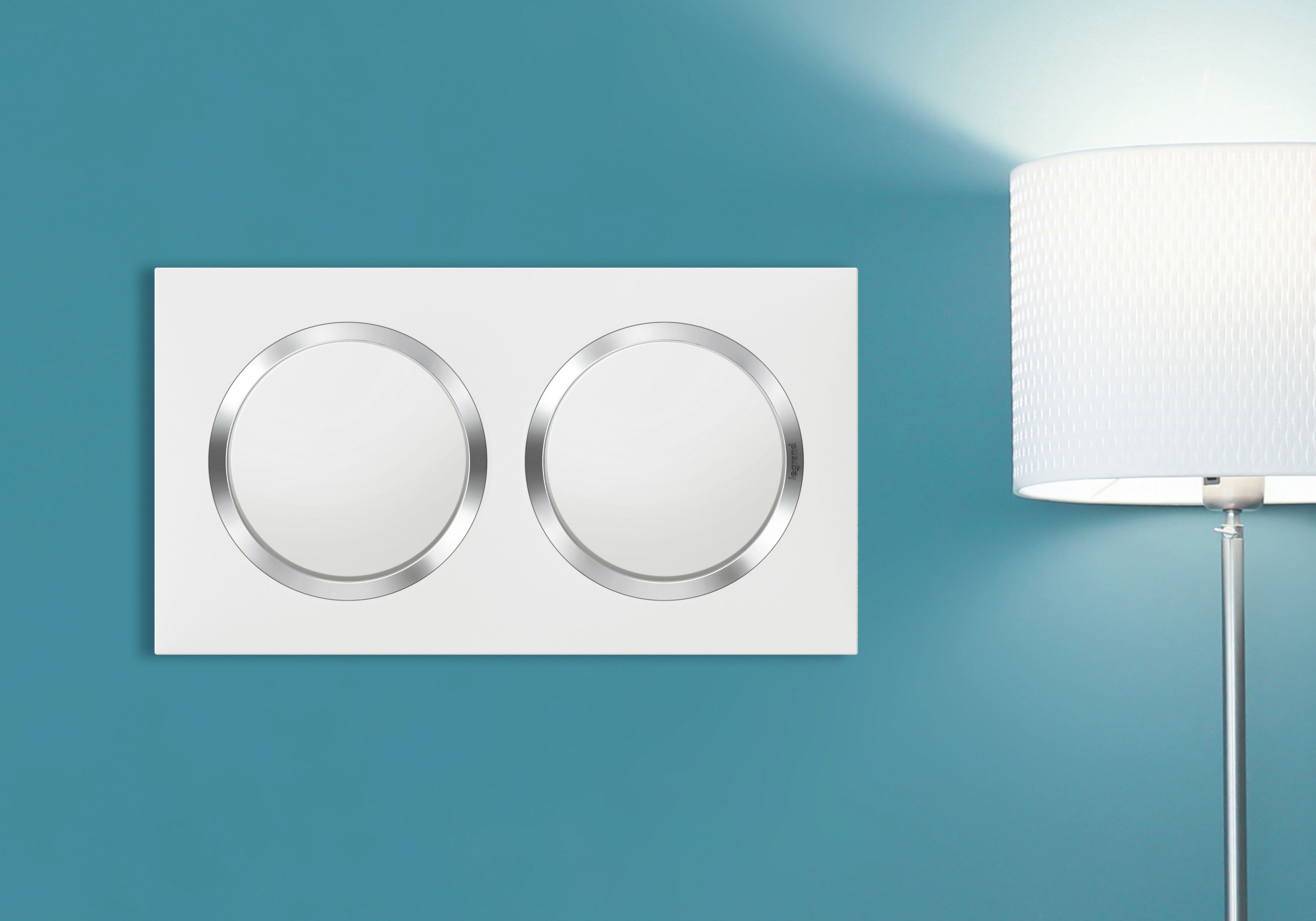 Plaque de couleur dooxie 2 postes carrée Finition Blanc bague effet chromé Montage possible en horizontal et vertical À associer à un mécanisme dooxie