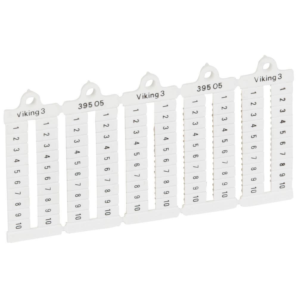 Plaque repères prédécoupés à lecture horizontale pour bloc de jonction Viking 3 pas 5mm avec chiffres 1 à 10 (10 fois)