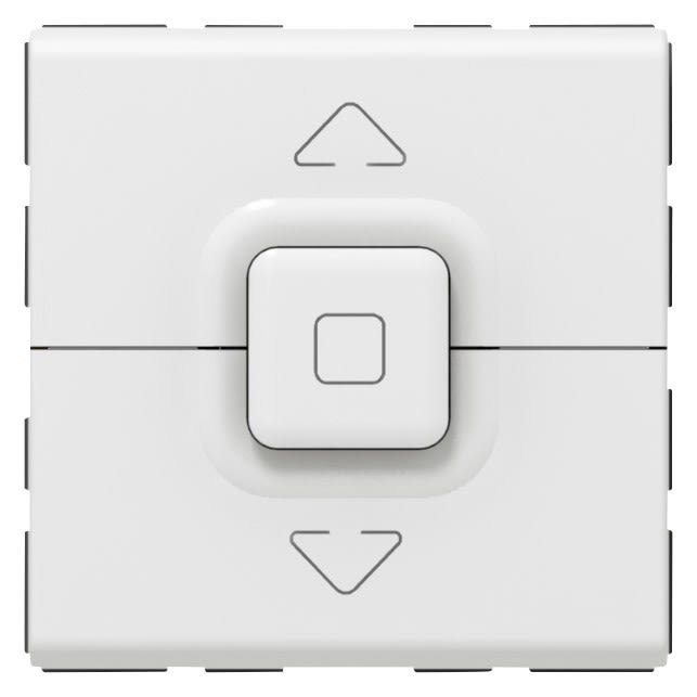 Poussoir pour 1 ou plusieurs volets roulants Mosaic 500W maximum avec 3 positions montée, stop et descente - 2 modules blanc RAL9003 finition brillante - à équiper de support et plaque Mosaic - peut être installé en encastré ou en saillie