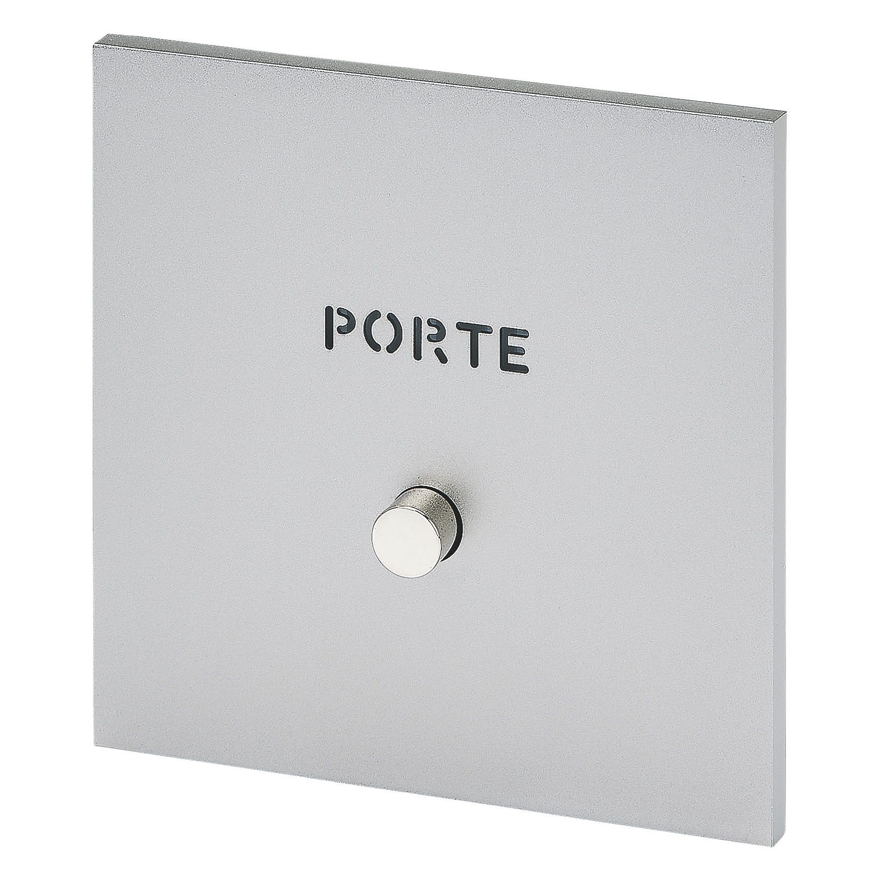 Poussoir lumineux avec marquage ~Porte~ Art d'Arnould Univers Epure Acier satin Dimensions grand carrée 80x80mm Se monte dans boîte d'encastrement 1 poste