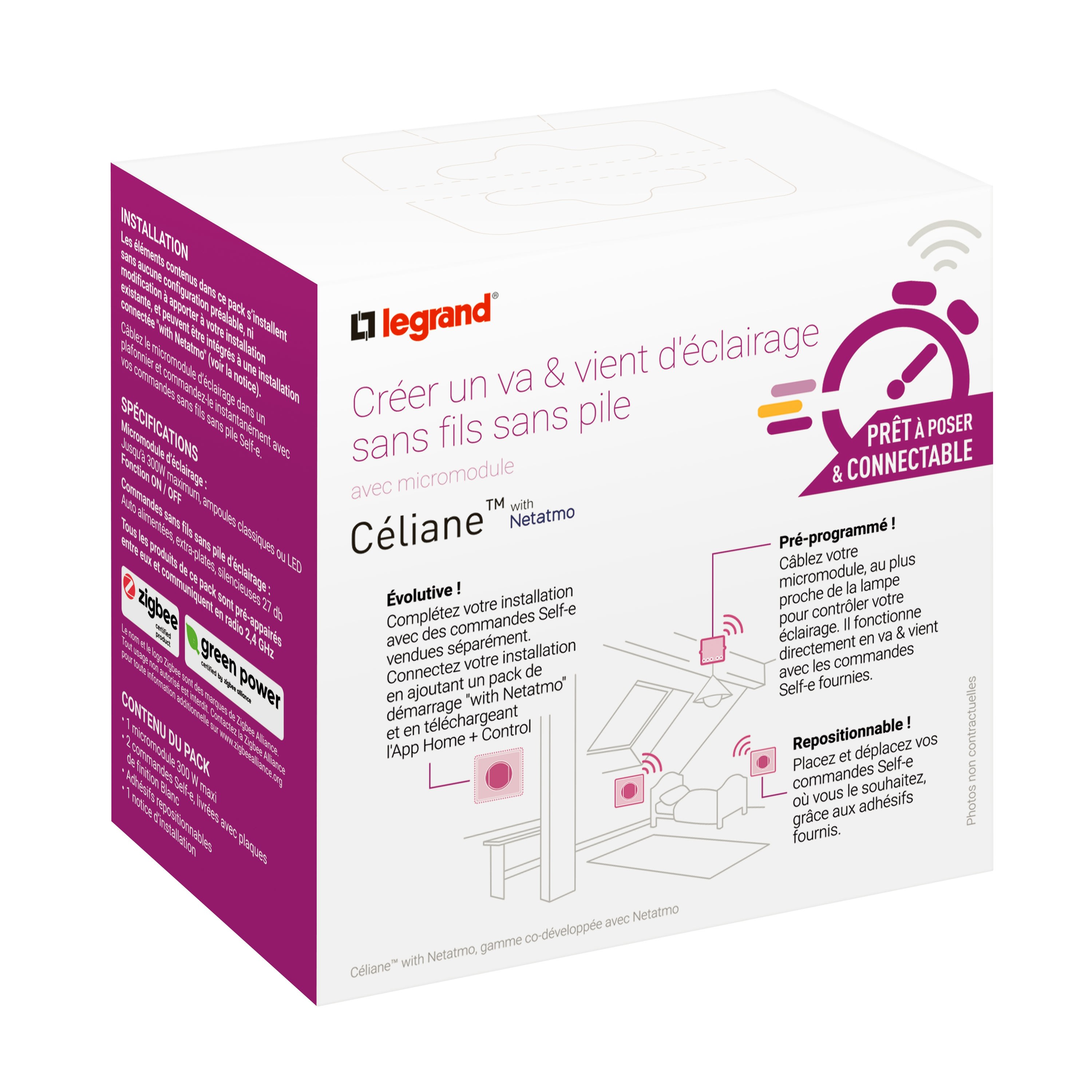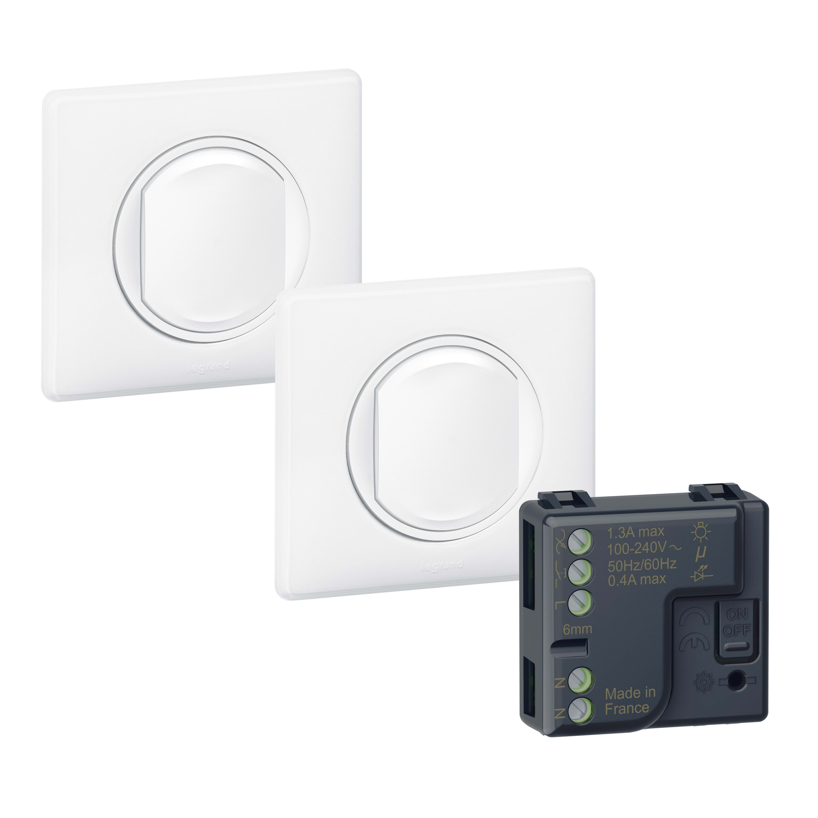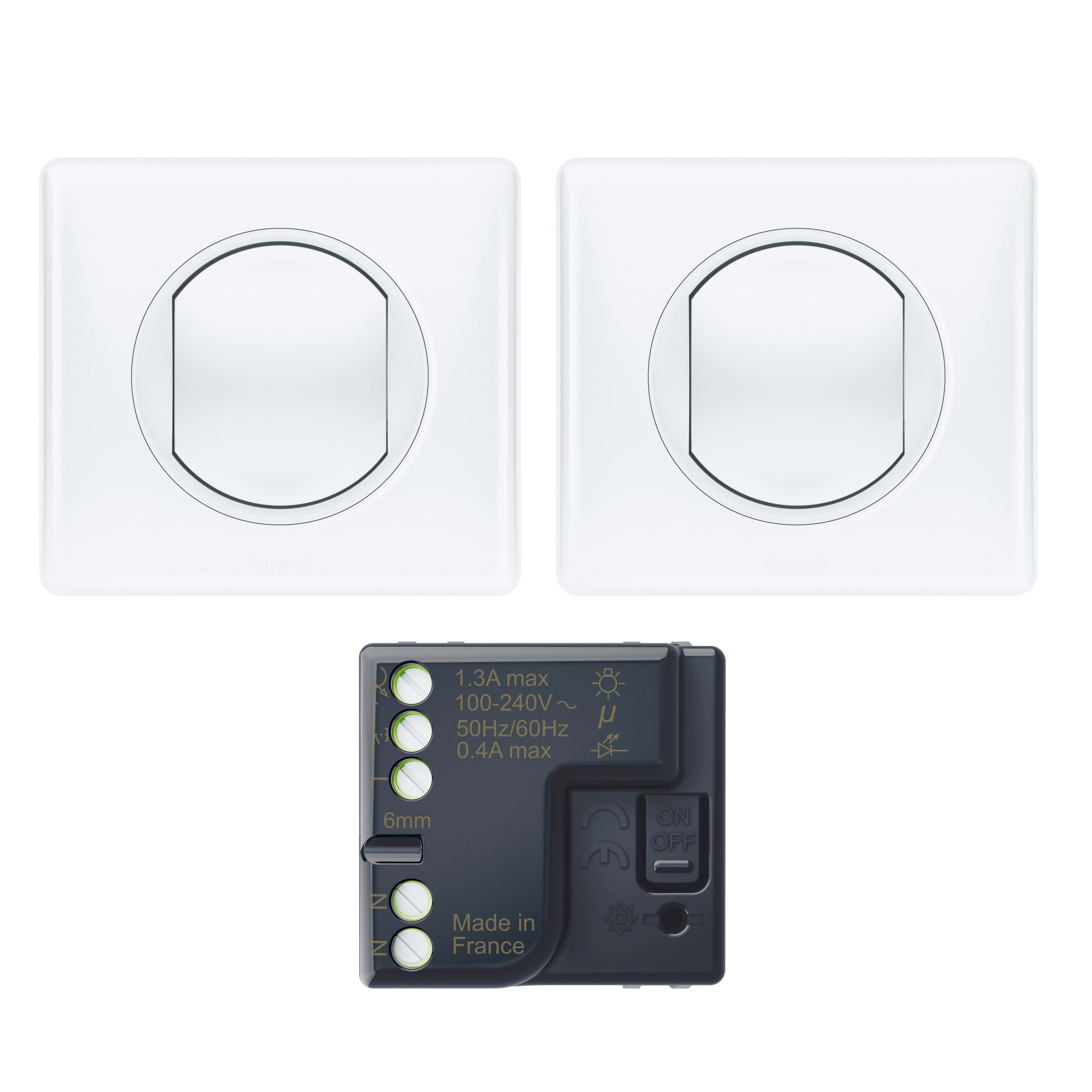 Micromodule d’éclairage : Jusqu’à 300W maximum, pour ampoules classiques et LED. Fonction ON / OFF Commandes sans fils sans pile d'éclairage : produit autonome - sans pile, sans alimentation électrique Tous les produits de ce kit sont pré-appairés entre eux et communiquent en radio 2,4 GHz Installation évolutive : Complétez votre installation radio avec des commandes sans fils sans pile d’éclairage et de prises, Céliane with Netatmo, vendues séparément Blanc