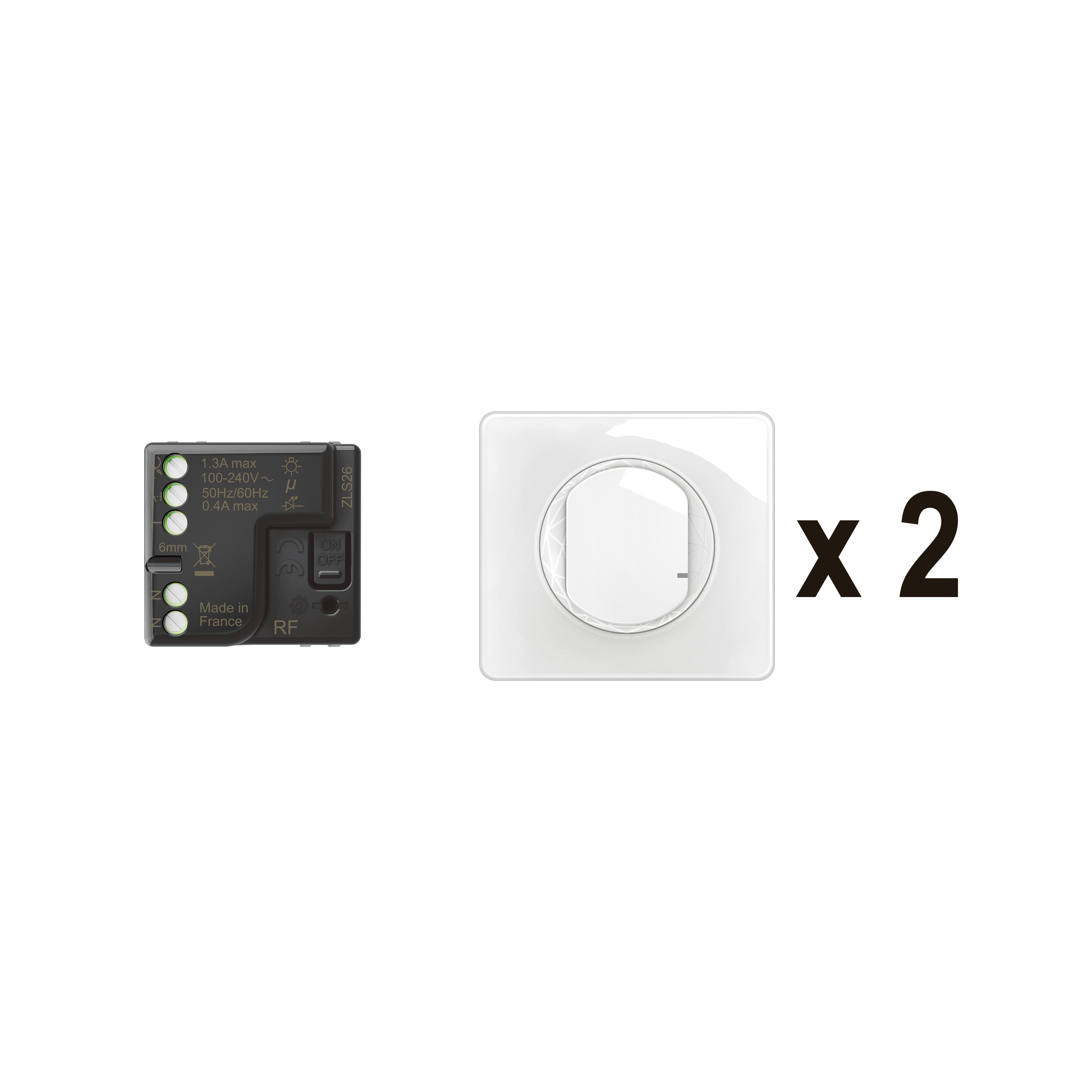 Permet de commander tout type d'éclairage depuis 2 points de commande sans tirer de fils Composition :- 1 micromodule d'éclairage ON/OFF 230 V~ (100 W LED), s'installe dans une DCL au plafond, une boîte de dérivation ou des appliques murales- 2 commandes d'éclairage sans fils livrées avec pile CR2032 3 V et adhésifs pour fixation murale ou à poser sur un meuble, fonction LED pour indication de batterie faible - finition Blanc - livrées complètes avec plaques de finition Blanc Emaillé Installation évolutive : en associant le Prêt-à-Poser à un pack de démarrage, les produits pourront être contrôlés via l'App. Home + Control et par la voix Possibilité de rajouter une commande sans fils