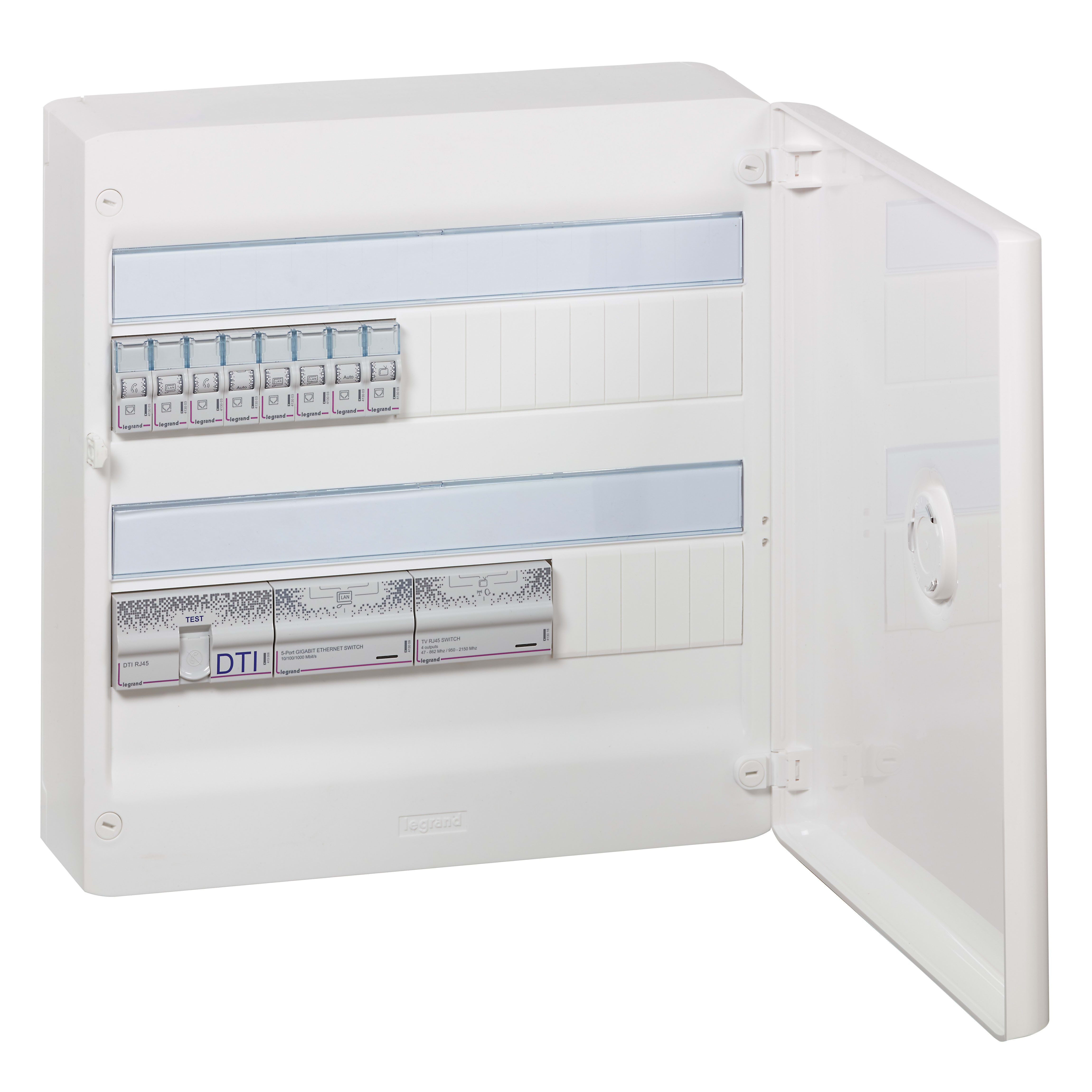 Composition :- 1 coffret Drivia 2 rangées 18 modules livré avec porte blanche- 1 DTI RJ45 modulaire- 1 parafoudre téléphone/ADSL RJ45- 1 switch Gigabit 4 sorties- 1 répartiteur amplificateur RJ45 TV hertzienne TNT satellite 4 sorties- 1 alimentation pour switch + répartiteur TV/RJ45- 8 modules de brassage RJ45 blindés catégorie6A STP- 8 cordons de brassage souples multimédia S/FTP- 1 bornier de terre- 1 support box opérateur ADSL/Fibre équipé de 1 prise 2P+T- 4 cordons de liaison box/coffret- 2 cordons télévision RJ45-IEC-F coaxiaux (longueur 2m)