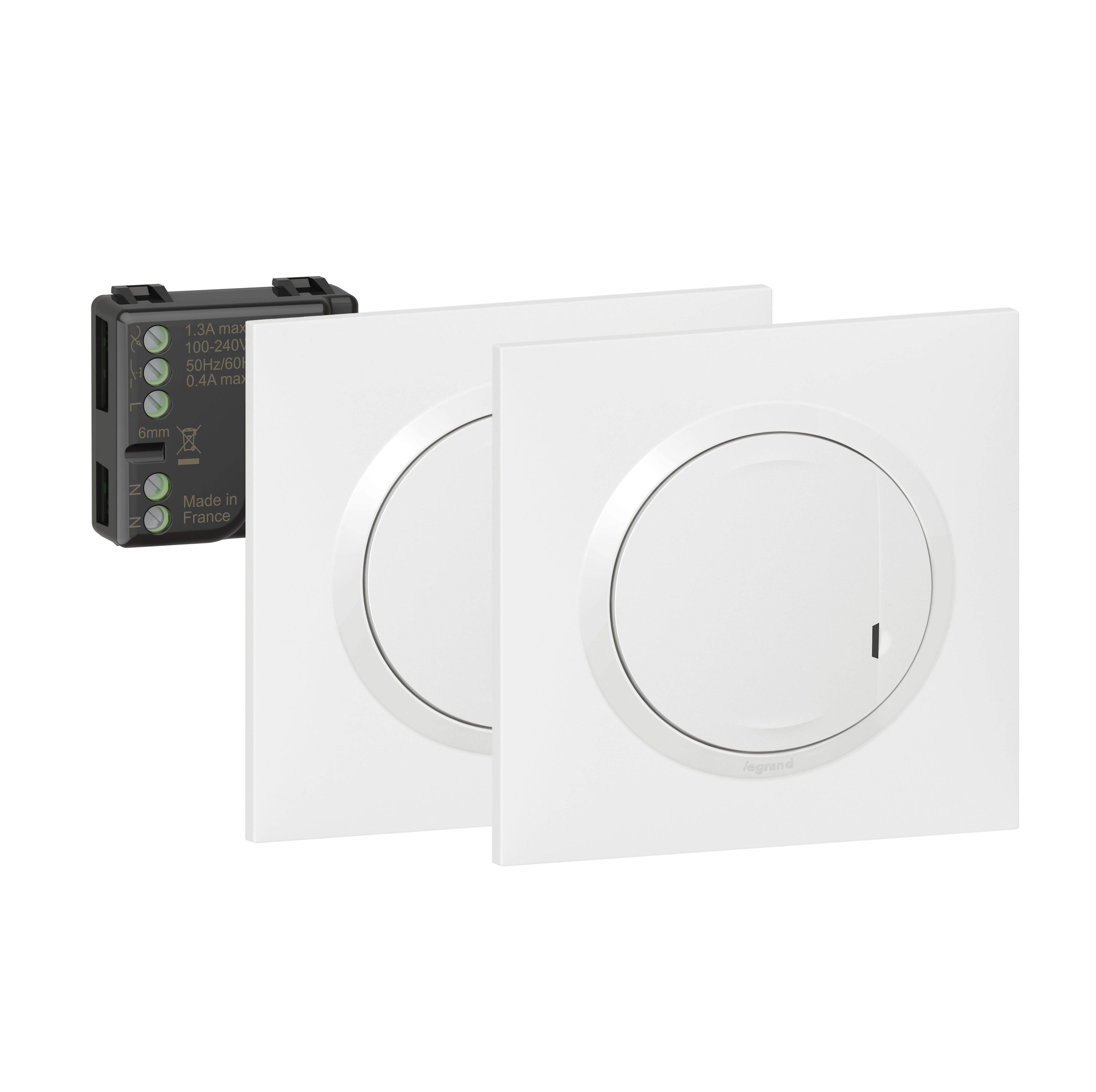 Prêt-à-Poser dooxie : créer un va-et-vient avec micromodule - Blanc Composition : - 1 micromodule d'éclairage ON/OFF 230VA jusqu'à 300W maximum, pour ampoules classiques et LED - 2 commandes sans fils d'éclairage livrées avec une pile remplaçable d'une durée de vie de 8 ans et avec plaques blanches et adhésifs pour fixation sur tous supports - Voyant LED avec indicateur de batterie faible Tous les produits de ce kit sont pré-appairés entre eux et communiquent en radio 2,4 GHz Installation évolutive : complétez votre installation radio avec des commandes sans fils d'éclairage et de prises dooxie with Netatmo, vendues séparément Blanc