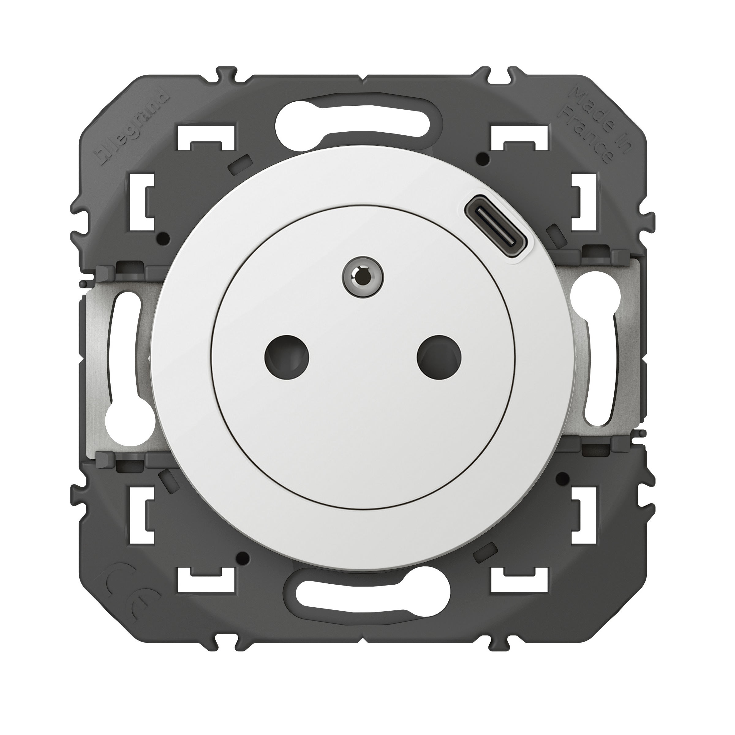 Prise de courant Surface + chargeur USB Type-C dooxie - Blanc - À équiper d'une plaque Le pictogramme en face (dessin d'une batterie) avant indique que la prise est dédiée à la charge Chargeur USB conforme à la directive CEE sur l'harmonisation du standard de recharge de terminaux portables et la réduction des chargers mobiles Auto-protégé contre les surtensions Montage possible en multiposte horizontal - Livré avec coque de protection chantier à charnières qui protège le produit de la poussière et des éclaboussures de peinture et permet au mécanisme de rester utilisable pendant le chantier