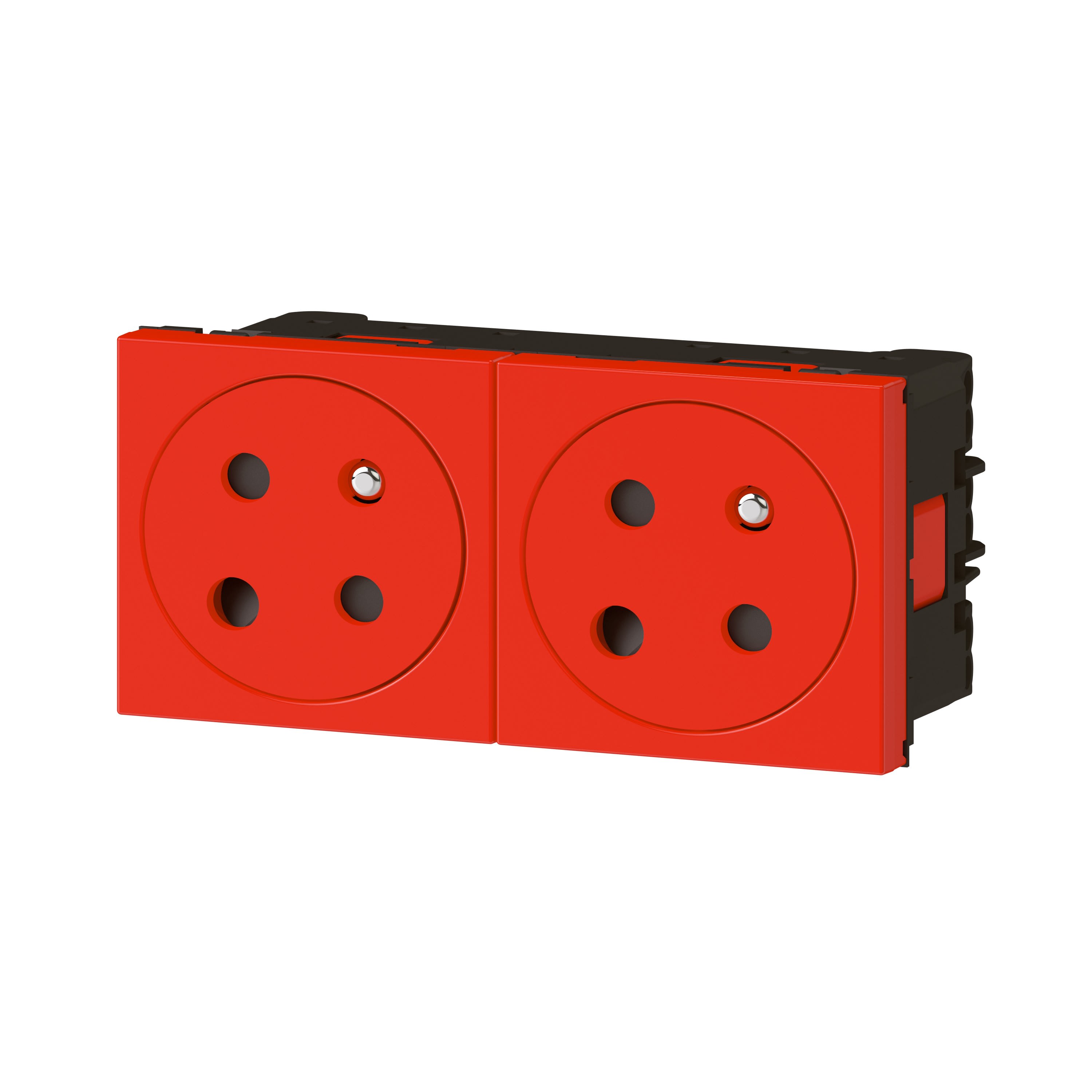 Prise de courant 2x2P+T Surface à détrompage Mosaic Link 16A 230V à connexion latérale par bornes automatiques bi-stables - À équiper d'un support et d'une plaque Mosaic 4 modules - Rouge à détrompage renforcant la sécurité permettant de bloquer l'utilisation de la prise en l'absence d'un détrompeur référence 050299 L'inclinaison à 45° des puits de prise permet de gagner de la place lors du branchement de plusieurs appareils electriques ou electroniques volumineux Résistance aux chocs renforcée : indice IK07 Connexion par bornes automatiques à levier permettant la connexion rapide sans outil