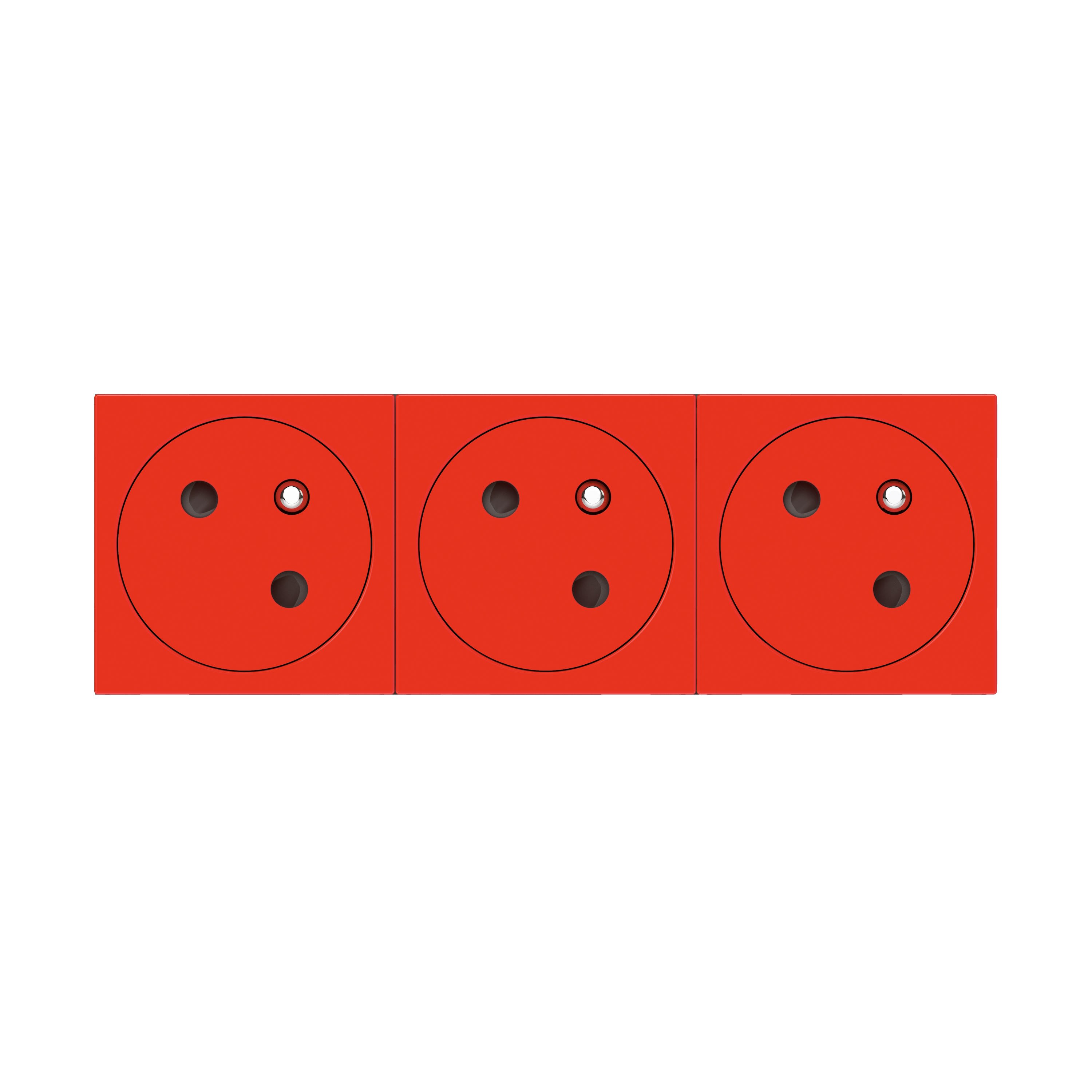 Prise de courant 3x2P+T Surface Mosaic Link 16A 230V à connexion latérale par bornes automatiques bi-stables - À équiper d'un support et d'une plaque Mosaic 6 modules - Rouge L'inclinaison à 45° des puits de prise permet de gagner de la place lors du branchement de plusieurs appareils electriques ou electroniques volumineux Résistance aux chocs renforcée : indice IK07 Connexion par bornes automatiques à levier permettant la connexion rapide sans outil