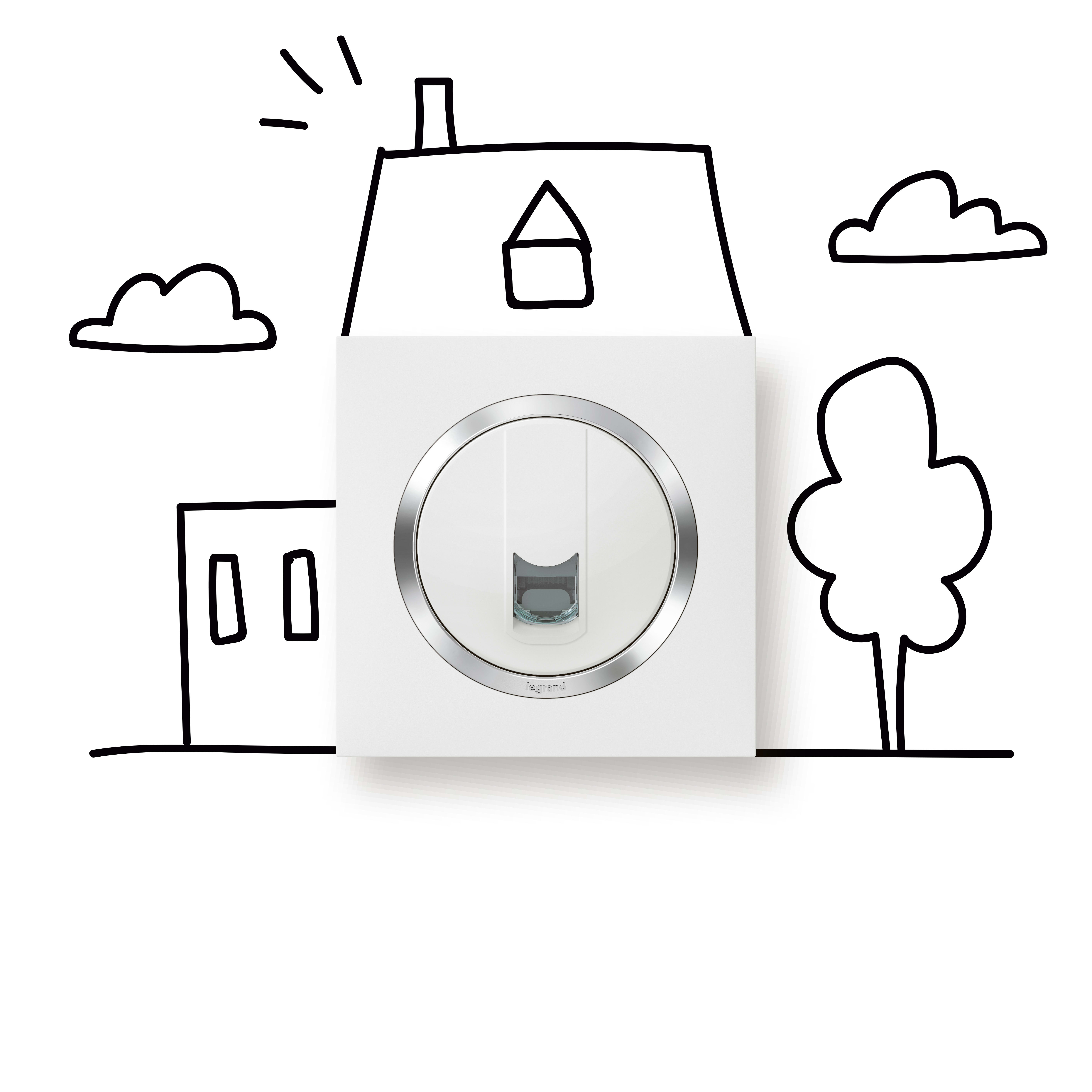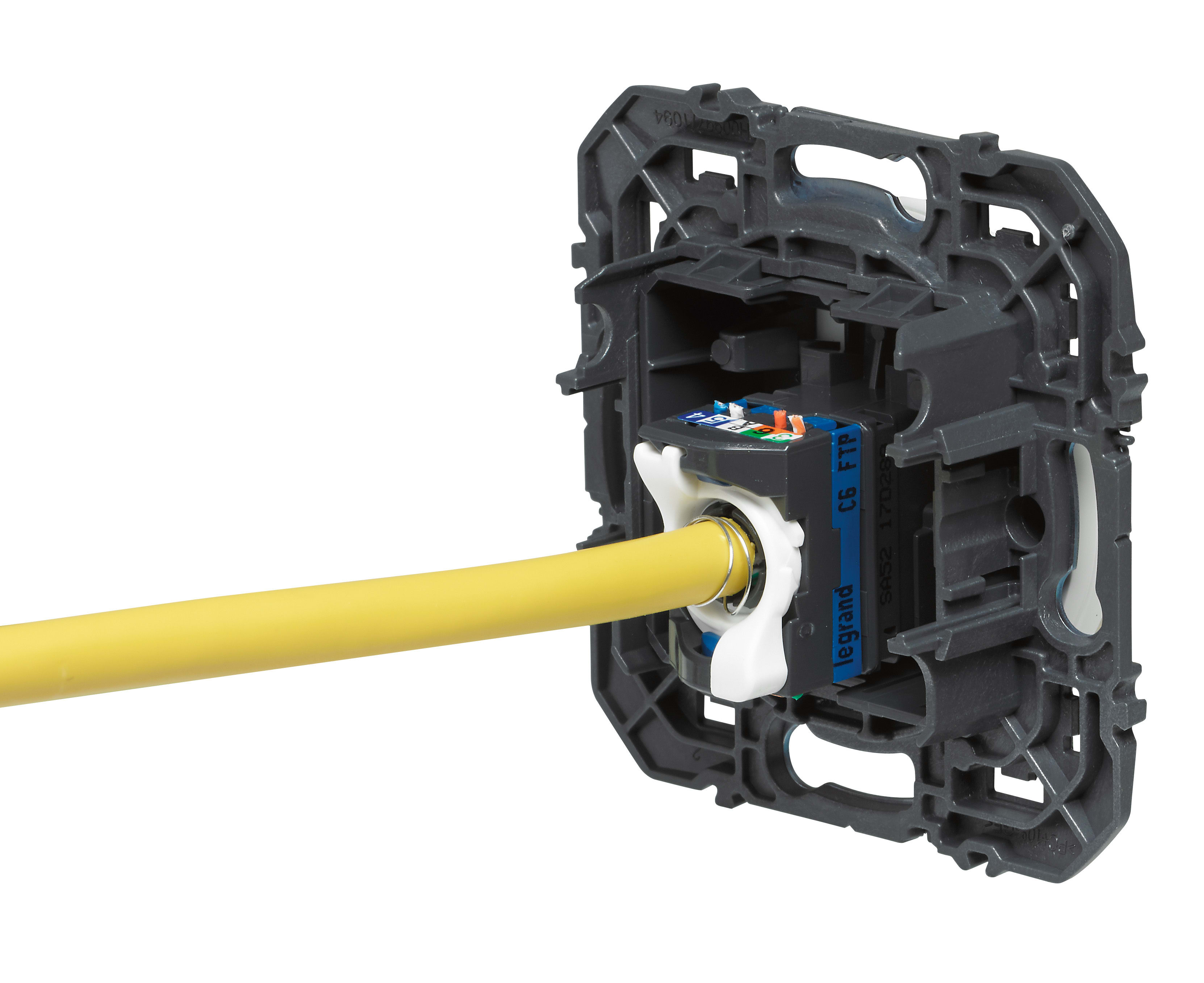 Prise RJ45 blindée catégorie6 STP dooxie - Blanc - À équiper d'une plaque Reçoit la TV (compatible Grade 2 TV et Grade 3 TV), le téléphone ou l'informatique Conforme aux normes ISO 11801, IEC 11801, EN 50173, ANSI 568 et TIA 568 Accepte les câbles monobrins AWG22 jusqu'à AWG26 et multibrins AWG26 - Repérage T568A et T568B avec codes couleurs Livrée avec coque de protection chantier à charnières : protège le produit de la poussière et des éclaboussures de peinture et permet à la prise de rester utilisable pendant le chantier