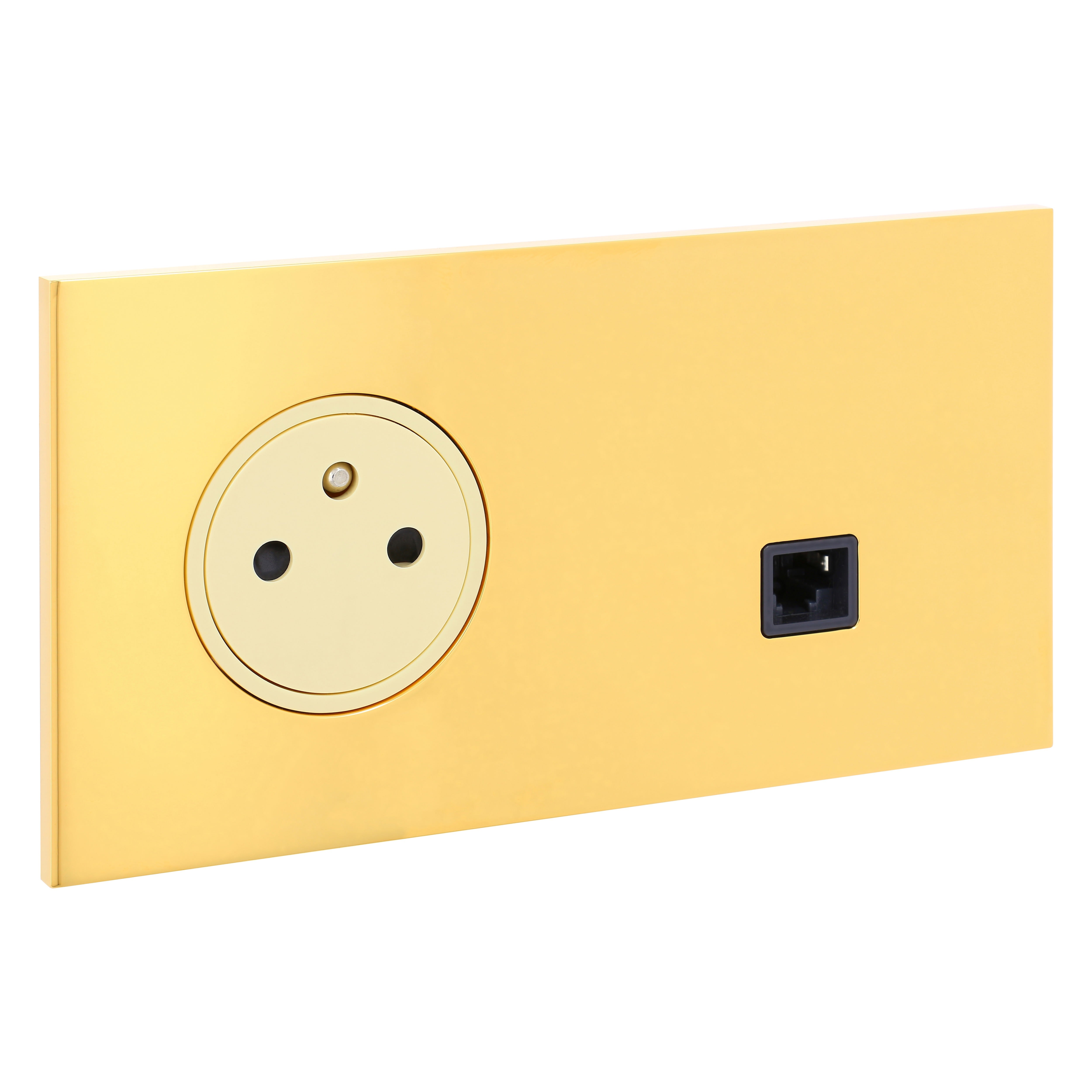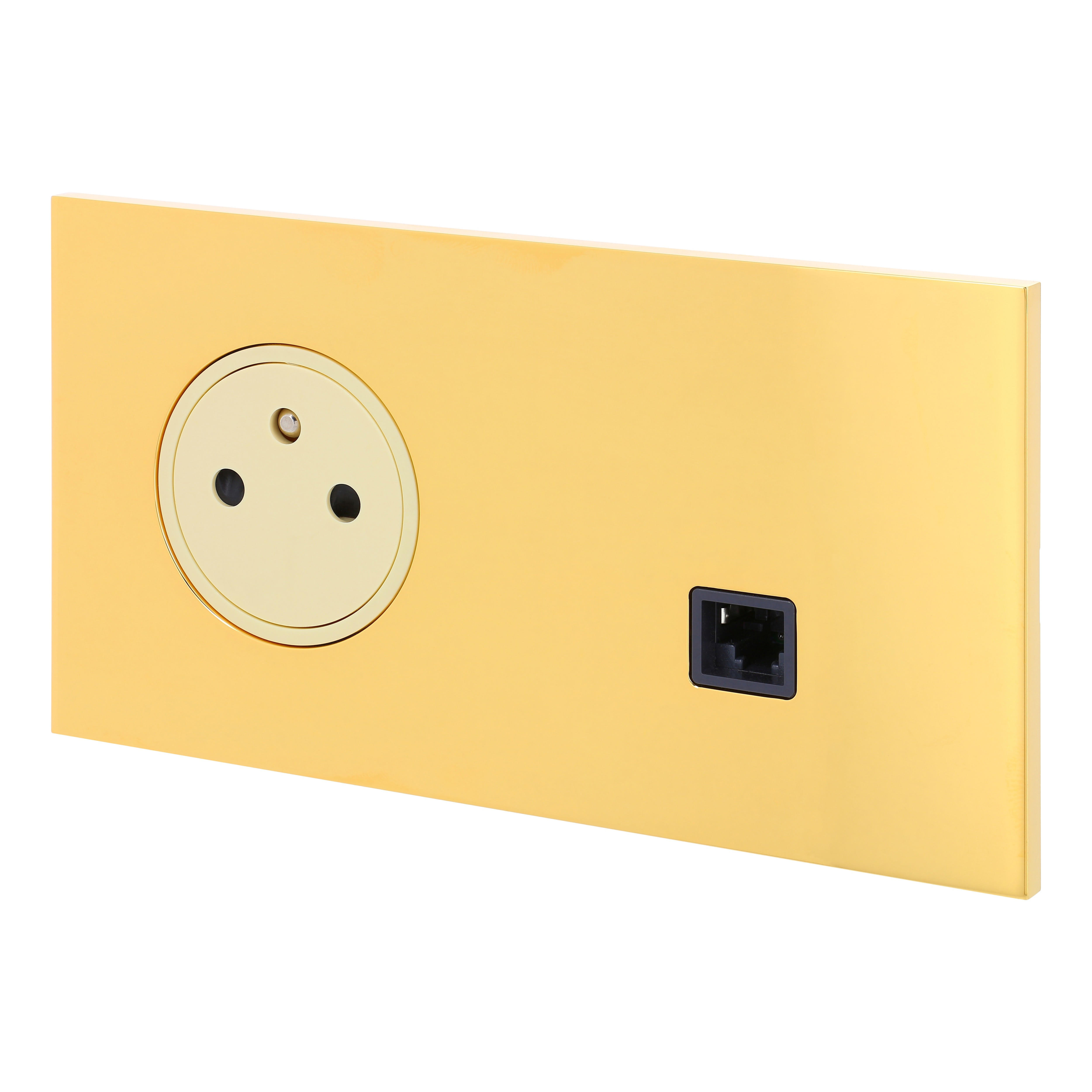 Prise de courant 2P+T Surface ivoire 16A 250V avec prise multimédia RJ45 catégorie 6 FTP Art d'Arnould univers Epure finition Or miroir monobloc format 2 postes