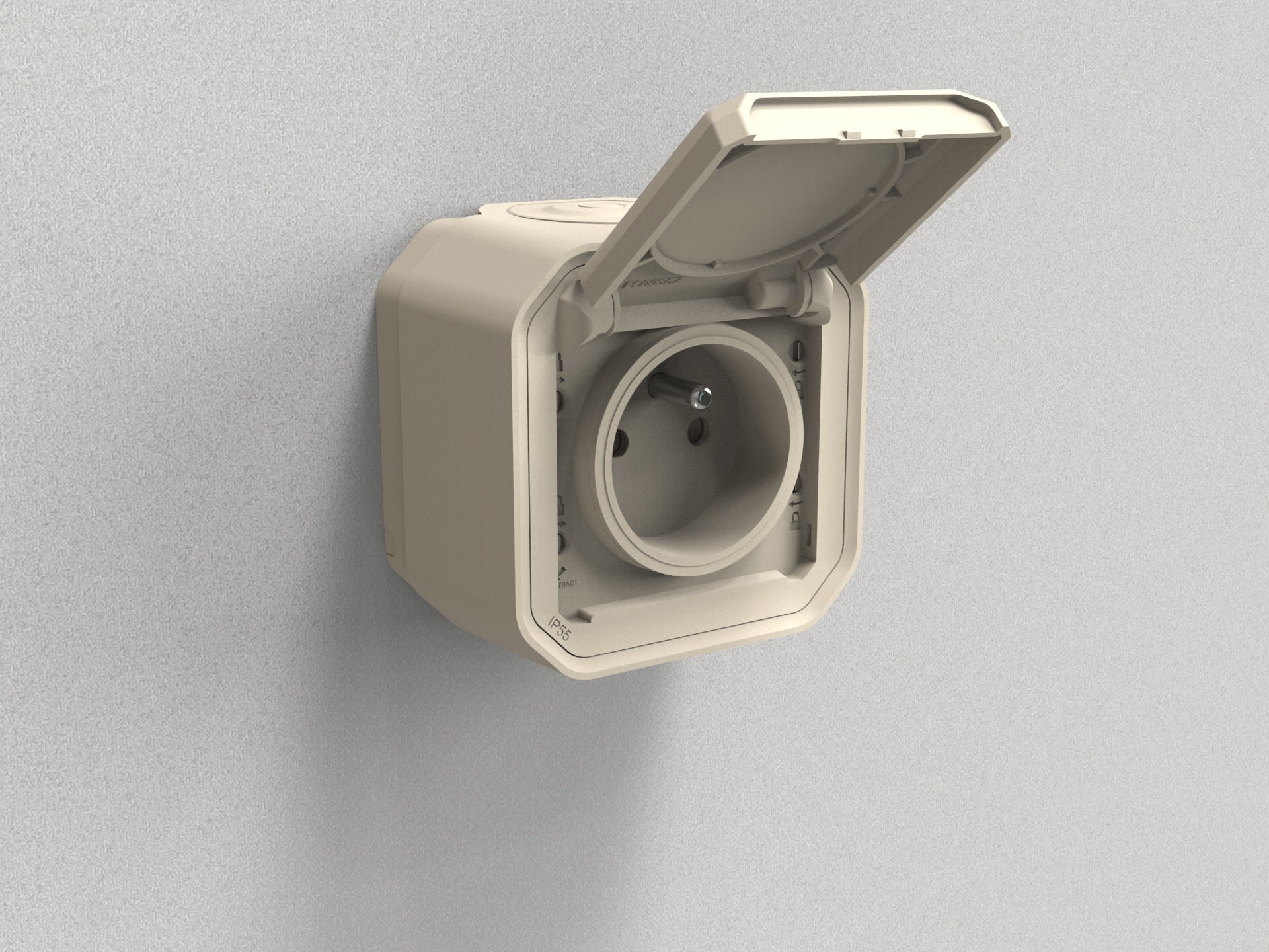 Prise de courant 2P+T 16A 250V - Connexion rapide sans outil avec repérage couleur Produit complet, prêt à être installé en saillie IP55 : protégé contre les poussières et les projections d'eau à la lance de toutes directions IK08 : résistance à un choc de 5 joules
