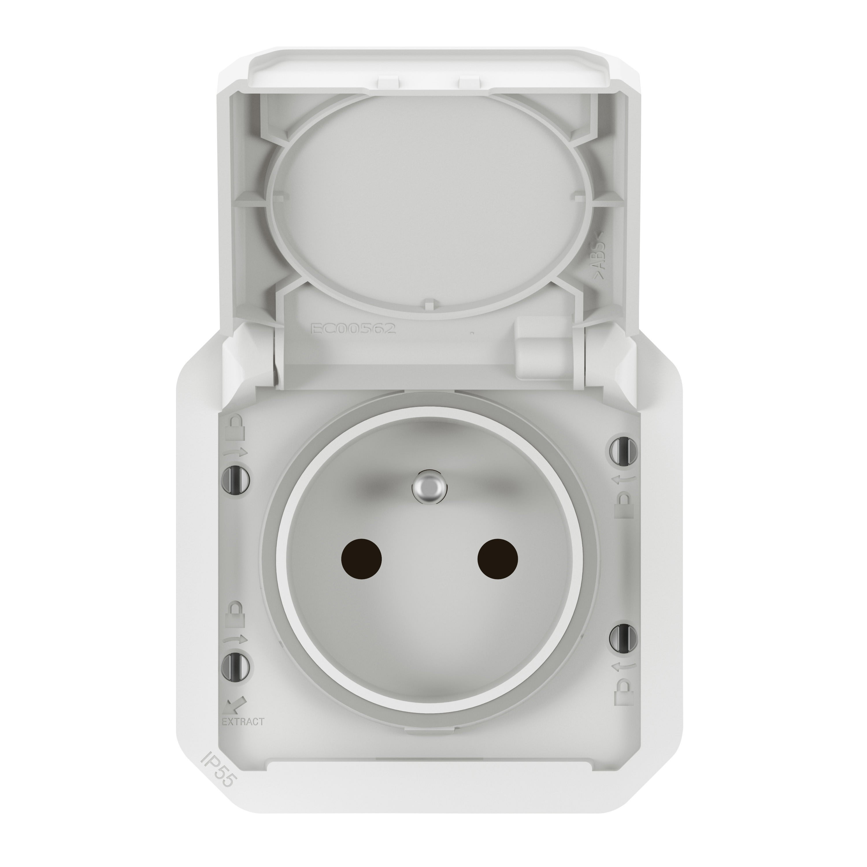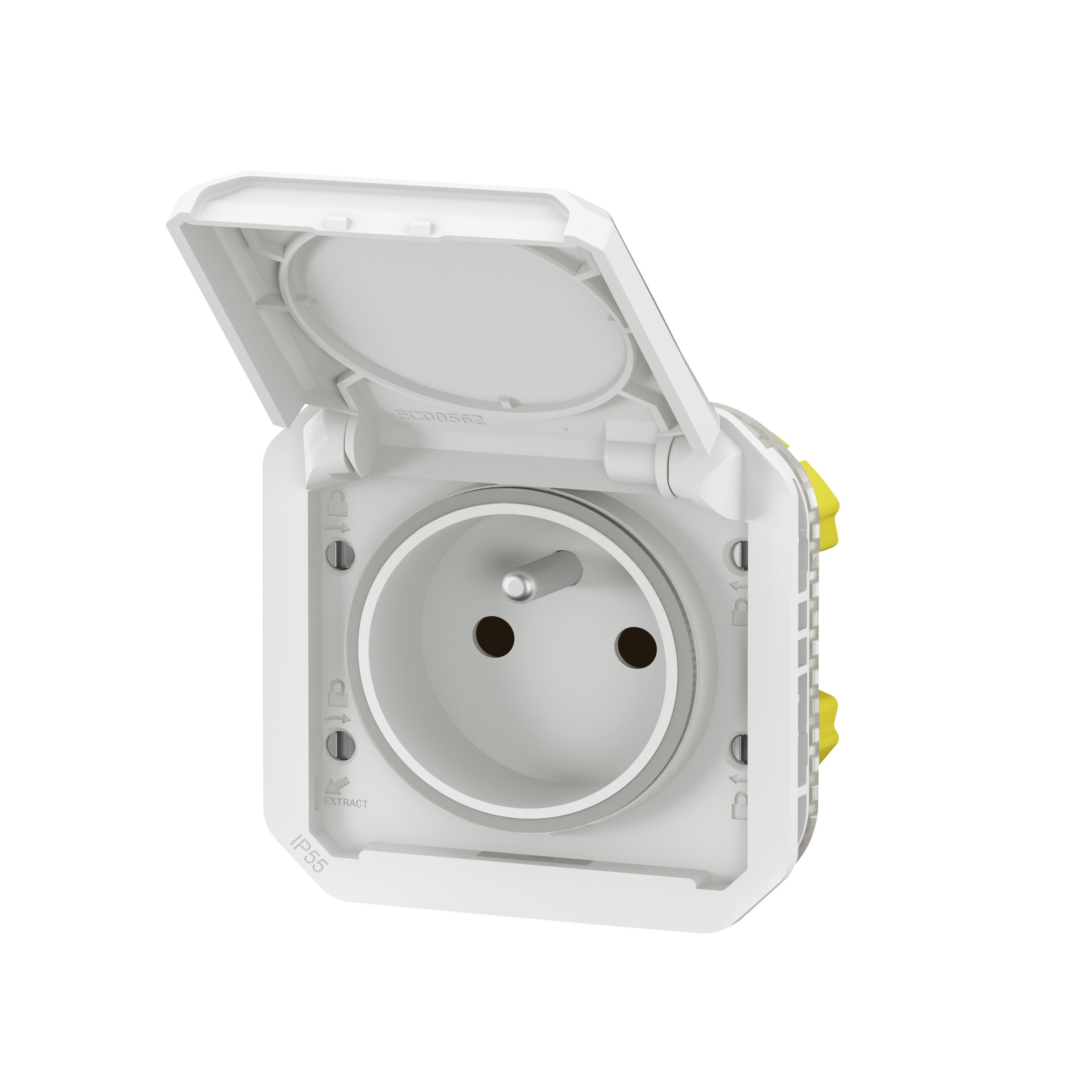 Prise de courant 2P+T 16A 250V - Connexion rapide sans outil avec repérage couleur Produit à compléter soit avec un boitier saillie, soit avec un support encastré IP55 : protégé contre les poussières et les projections d'eau à la lance de toutes directions IK08 : résistance à un choc de 5 joules