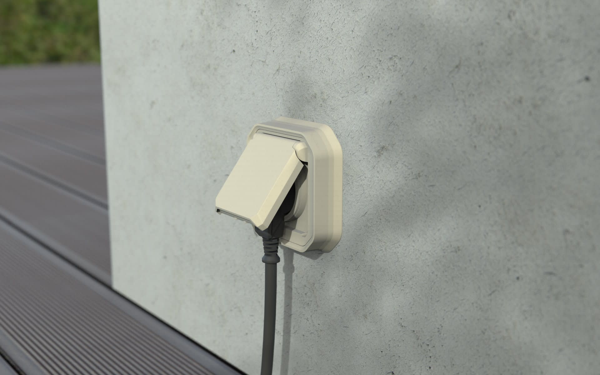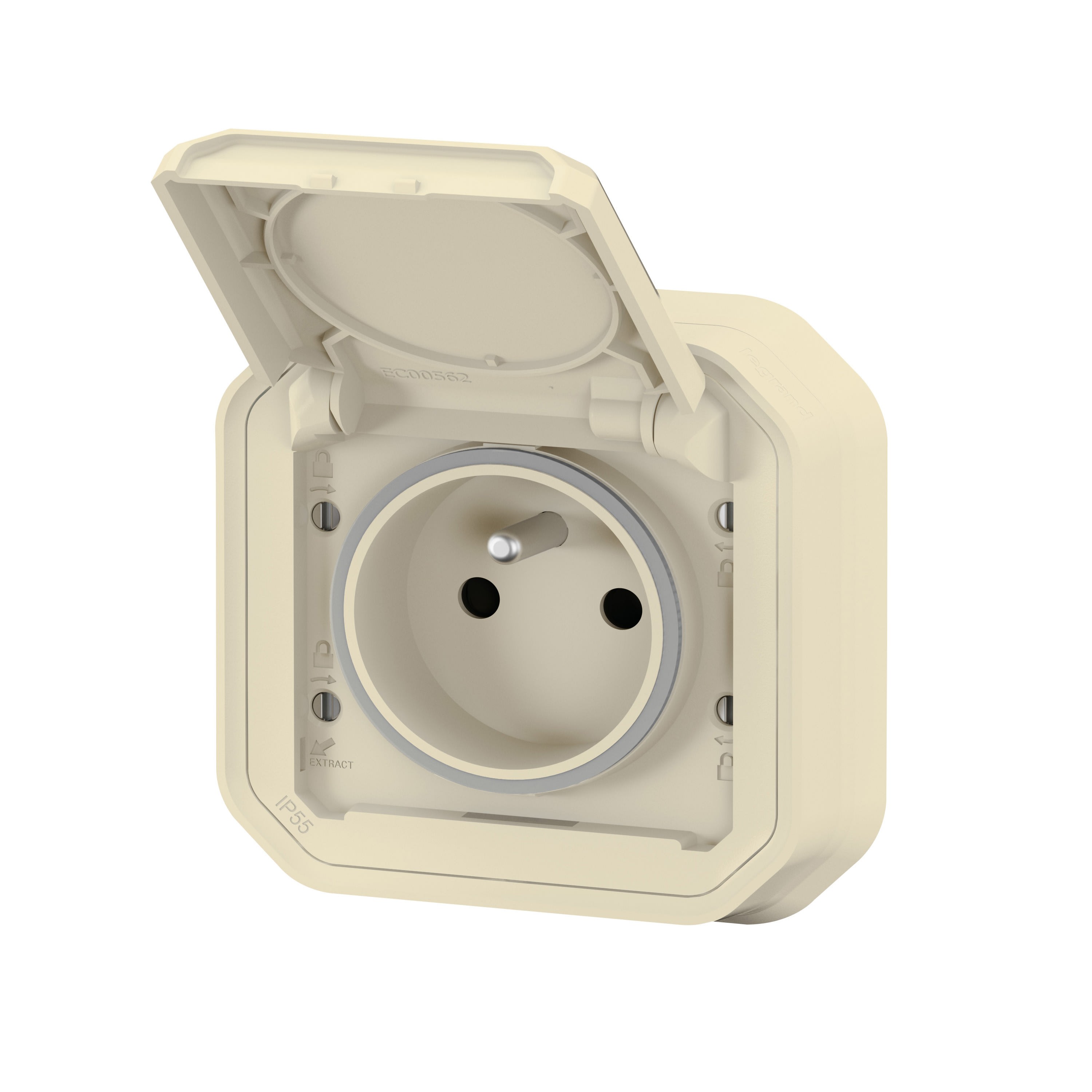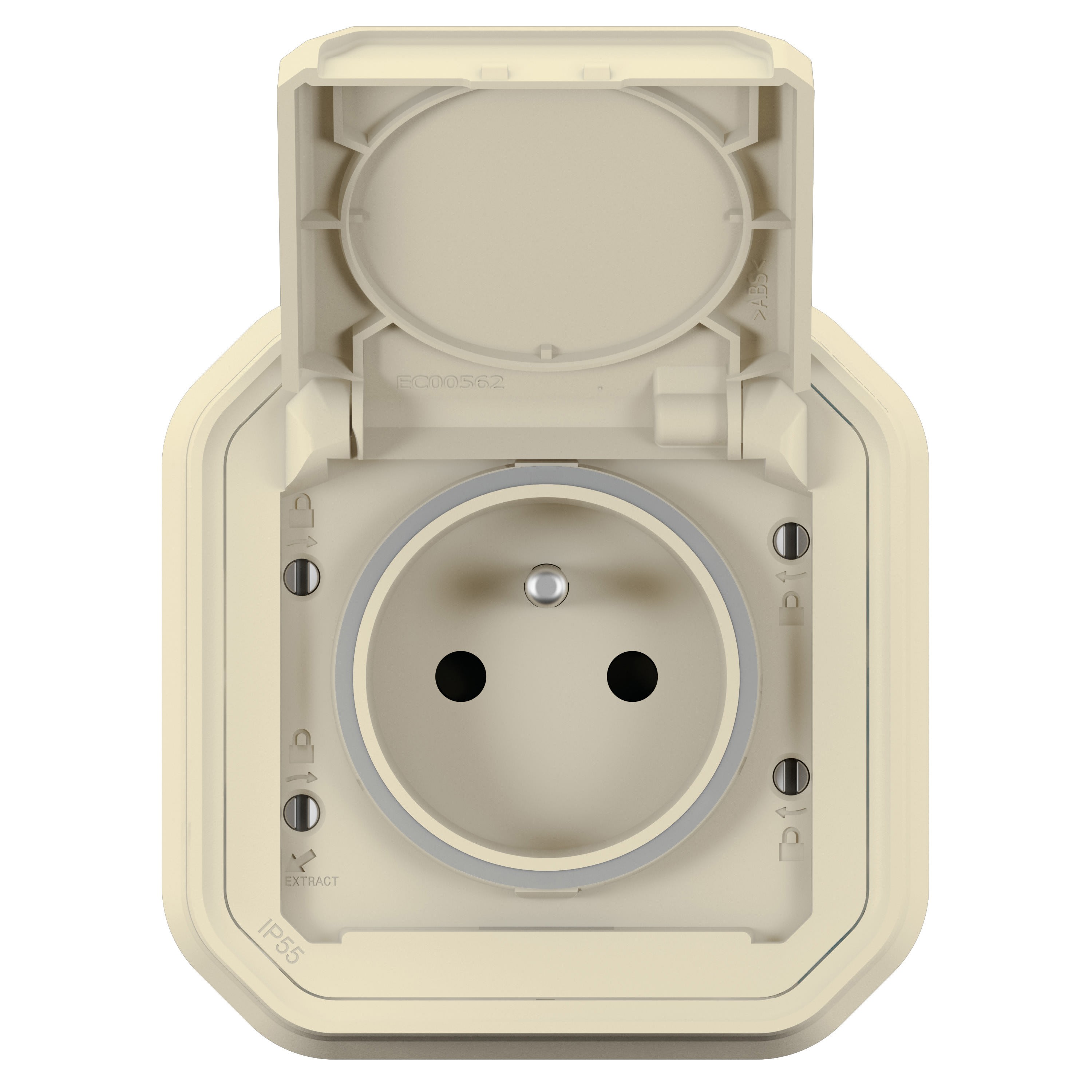 Produit complet, prêt à être installé sur une boite d'encastrement à griffes. IP55 : protégé contre les poussières et les projections d'eau à la lance de toutes directions. IK08 : résistance à un choc de 5 joules. Prise de courant 2P+T 16A 250V. Connexion rapide sans outil avec repérage couleur.