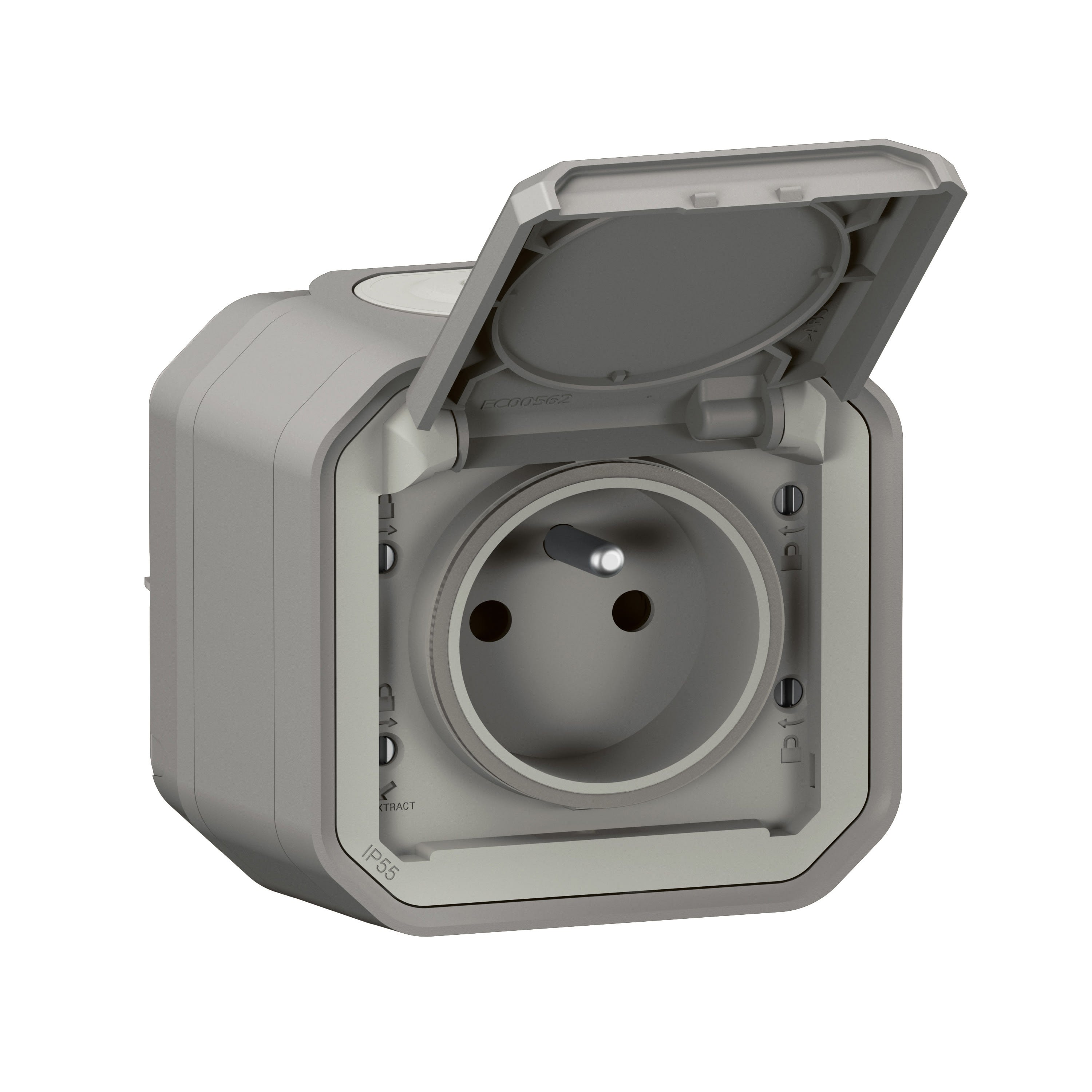 Prise de courant avec terre étanche IP55 avec volet Plexo 16A 250V livrée complète avec boîtier, prête à installer en apparent au mur - finition gris avec emballage brochable