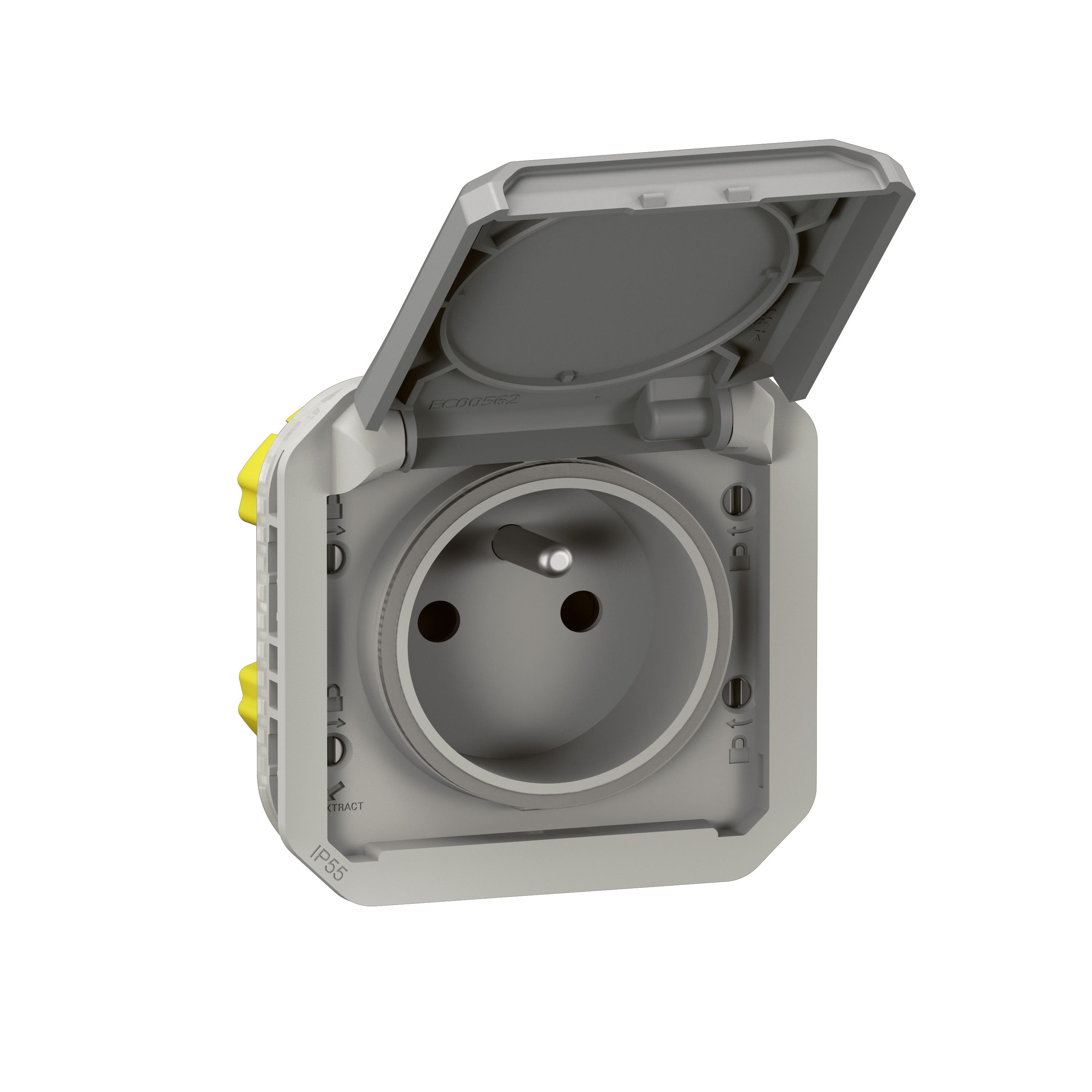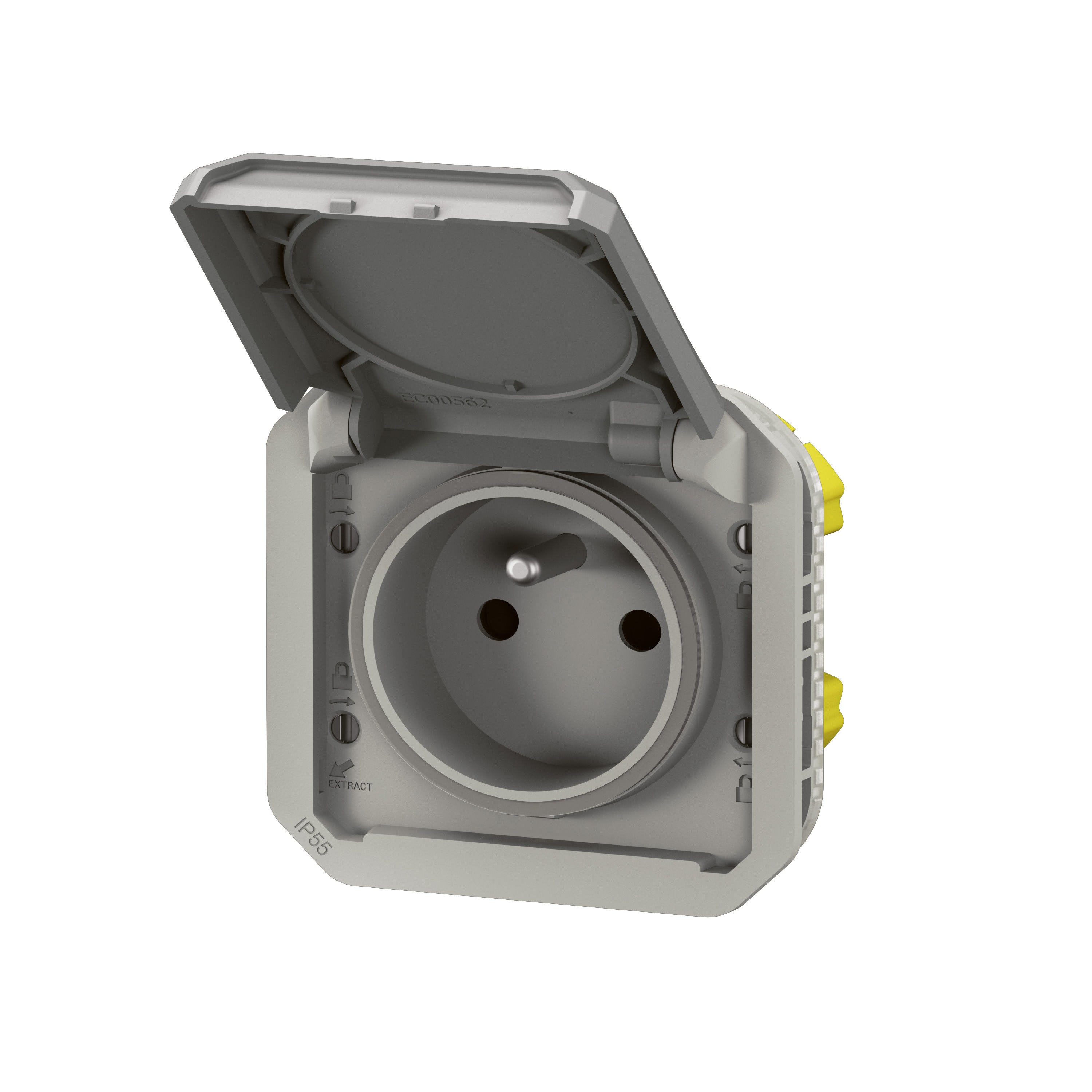 Produit à compléter soit avec un boitier saillie, soit avec un support encastré. IP55 : protégé contre les poussières et les projections d'eau à la lance de toutes directions. IK08 : résistance à un choc de 5 joules. Prise de courant 2P+T 16A 250V. Connexion rapide sans outil avec repérage couleur.