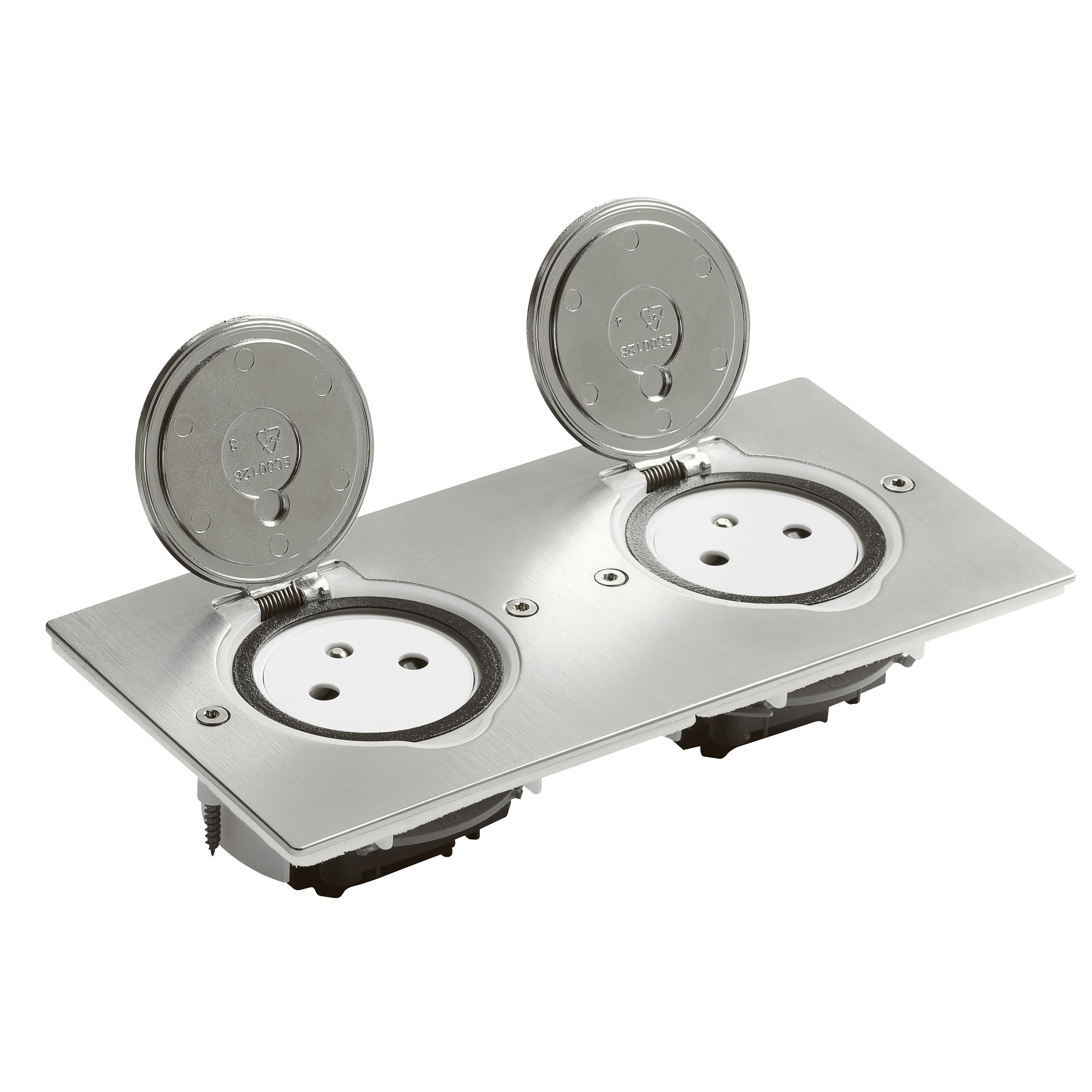 Prise de sol et plan de travail double équipée de 2 prises 2P+T Surface 16A 250V Inox brossé - IP44 IK08 Avec éclips de protection - Connexion par bornes automatiques permettant la connexion rapide sans outil Format rectangulaire 172x86mm Devient lumineux par installation de l'accessoire voyant LED - Vis avec empreinte torx qui limite le démontage non souhaité