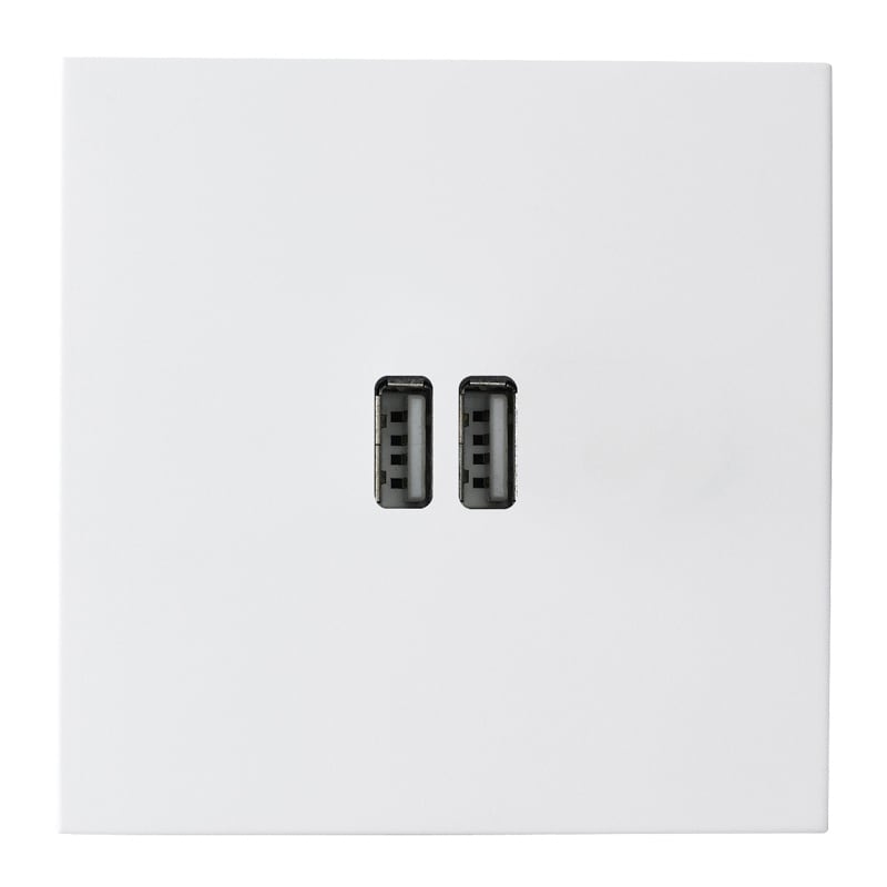 Chargeur 2 USB Type-A 3A Art d'Arnould Univers Epure Blanc satin Dimensions grand carrée 80x80mm Se monte dans boîte d'encastrement 1 poste Conforme aux normes : CEI 62368 -1 (Sécurité) et ETSI EN 301489 - 34 (CEM)