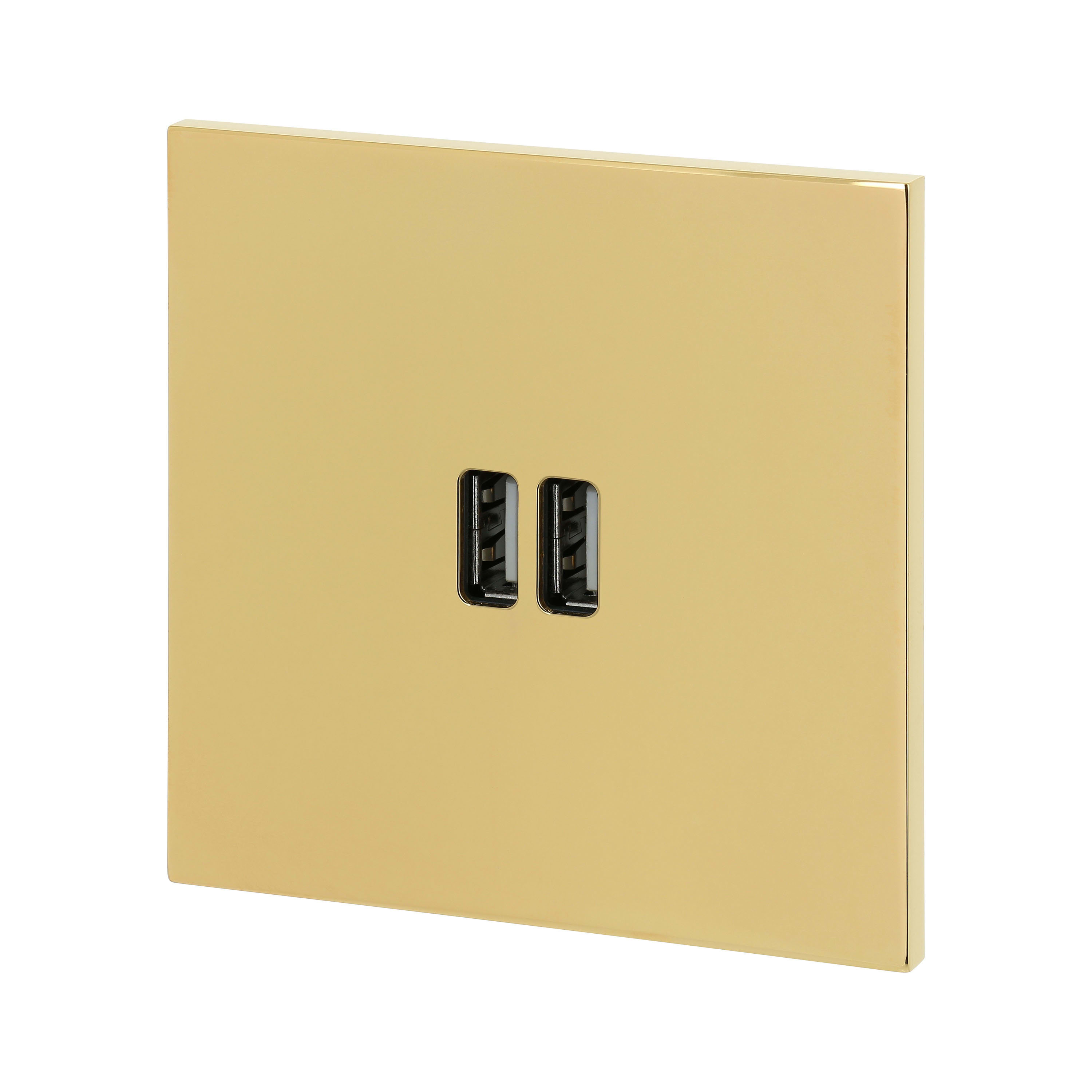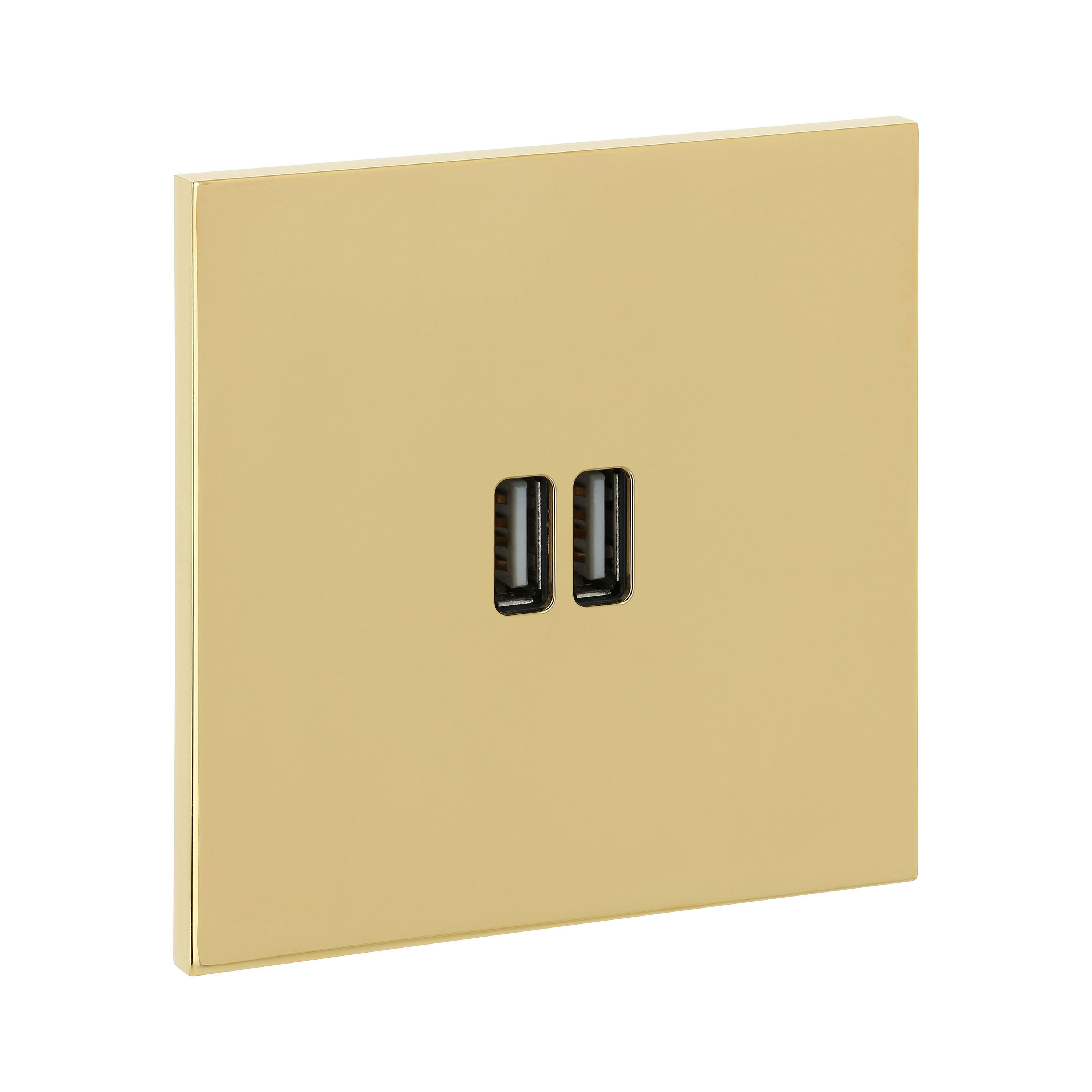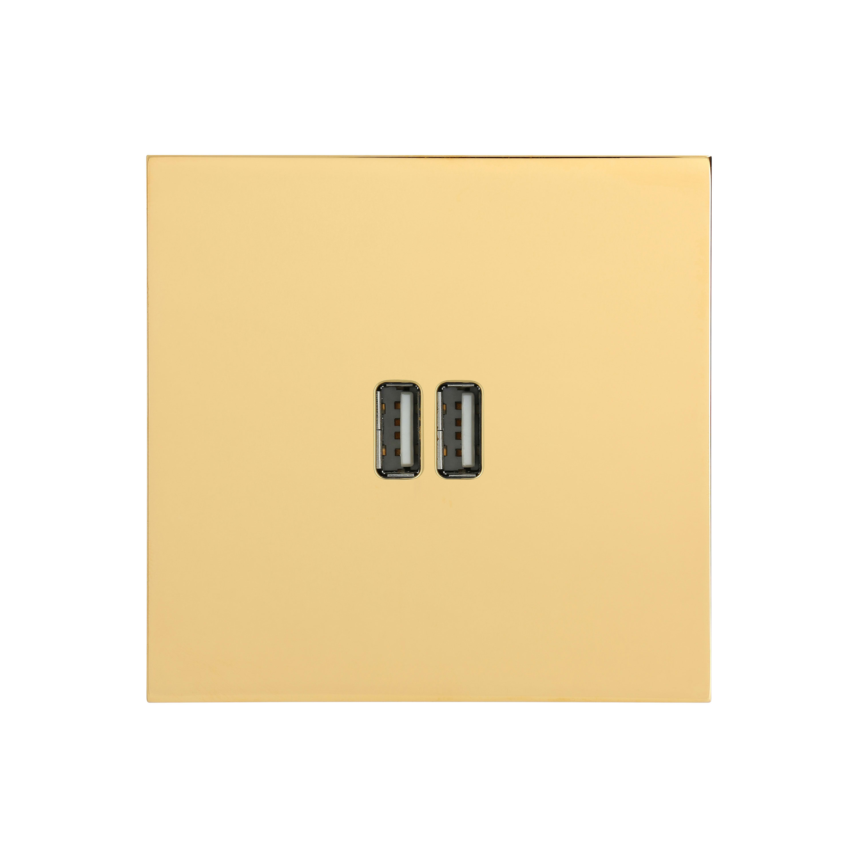 Chargeur 2 USB Type-A 3A Art d'Arnould Univers Epure Or miroir Dimensions grand carrée 80x80mm Se monte dans boîte d'encastrement 1 poste Conforme aux normes : CEI 62368 -1 (Sécurité) et ETSI EN 301489 - 34 (CEM)