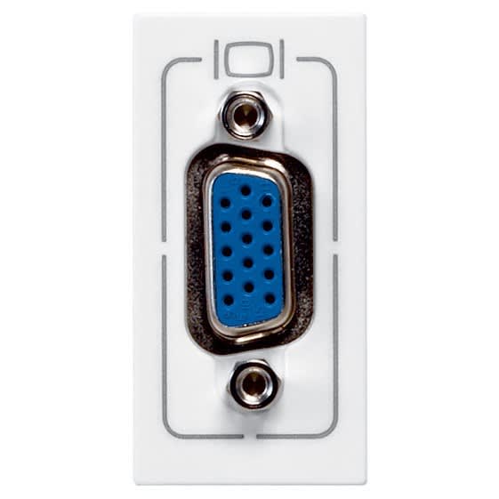 Prise HD15 femelle préconnectorisée Mosaic - A équiper d'un support et d'une plaque Mosaic Préconnectorisée : équipée d'un cordon de longueur 15cm et de 2 connecteurs femelle 1 module - Blanc RAL9003 finition brillante Définition VGA, XGA, UXGA selon la carte graphique de l’ordinateur Longueur maximum entre 2 prises : 5m