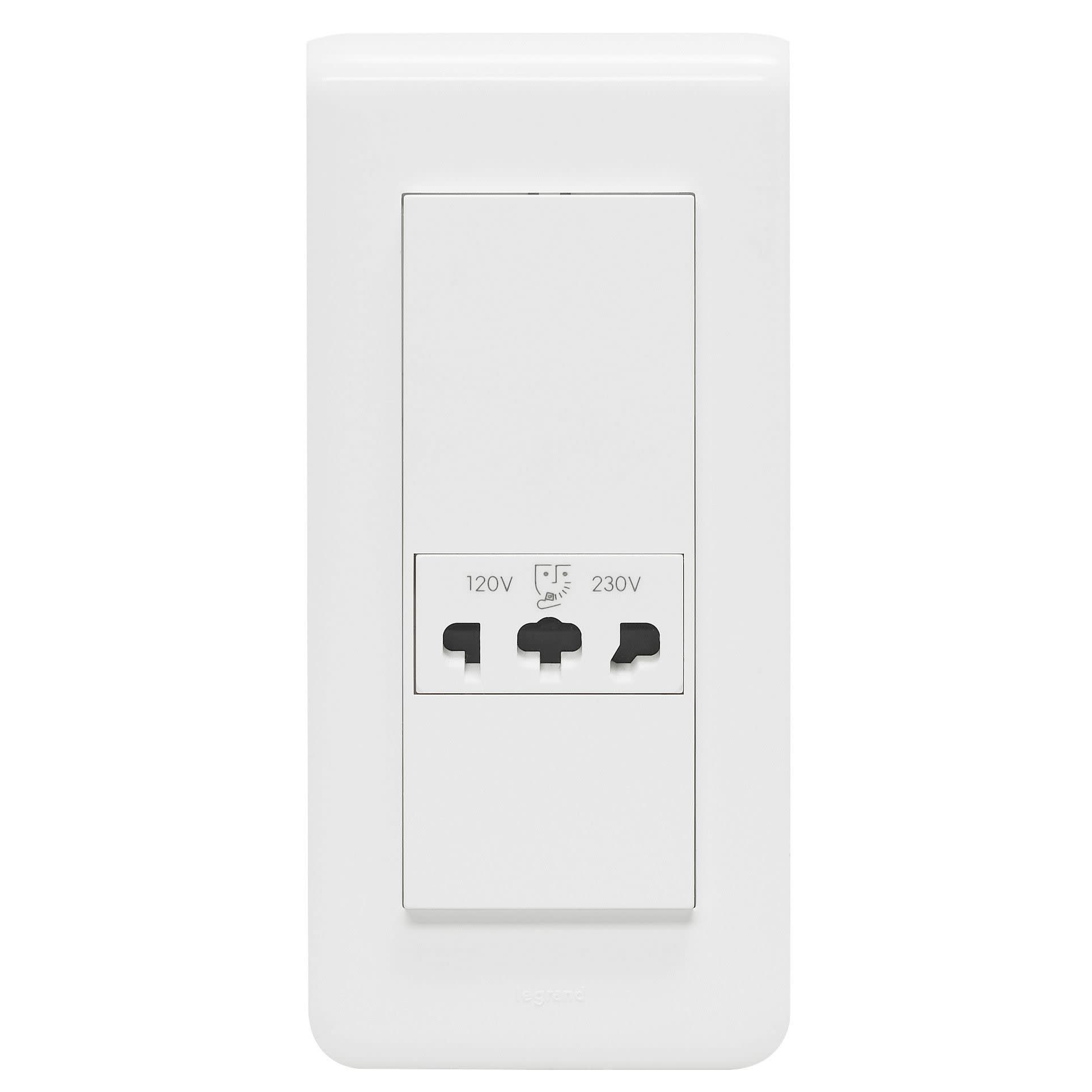 Prise rasoir Mosaic 230V sortie 120-V à 230V - 50Hz à 60Hz - Livrée complète avec support et plaque de finition 5 modules - Blanc RAL9003 finition brillante IP24 IK04 - Permet de bénéficier dans le volume 2 de la salle de bains d'une prise électrique sécurisée Repérage des bornes facilitant le câblage Connexion par bornes automatiques à levier permettant la connexion rapide sans outil