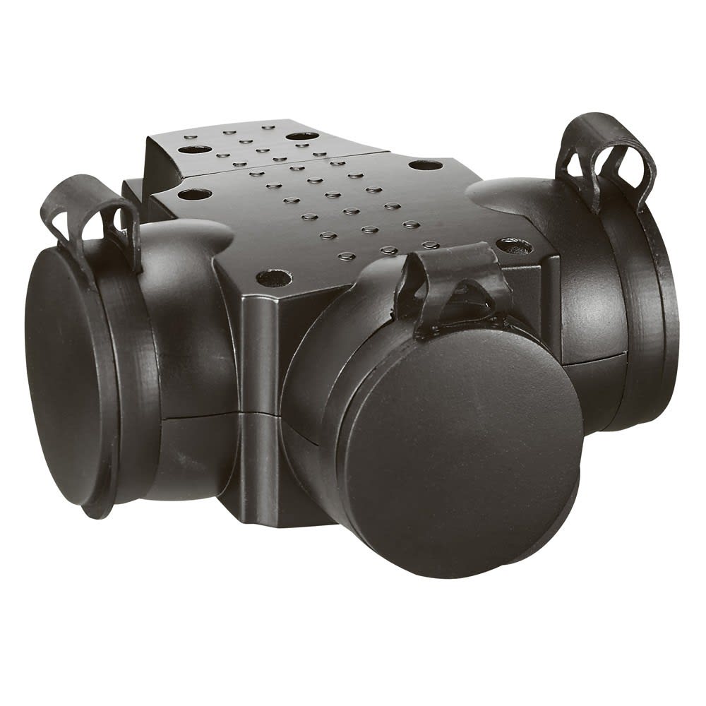 Prolongateur caoutchouc 3 prises de courant 2P+T - IP44 - IK08 6A : Ø4mm - 10A - 16A : Ø4,8mm - A câbler - Avec anneau de suspension - Dimensions : 174mm x 105mm x 57mm Bonne résistance aux chocs Avec éclips de protection Equipé de bouchons IP44