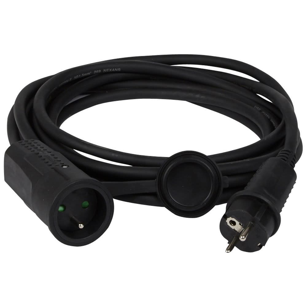 Rallonge caoutchouc pour chantier ''prête à l'emploi'' IP44 - IK08 2P+T - 16A - Avec prolongateur ergonomique en caoutchouc équipé d'éclips de protection et bouchon et câble 5m - standard - Noir Résistance au choc et au frottement Câble H 07 RNF 3G 1,5mm² Conformes aux recommandations de l'OPPBTP (Organisme Professionnel de Prévention du Bâtiment et des Travaux Publics)- Livrées avec étiquette avec Gencod