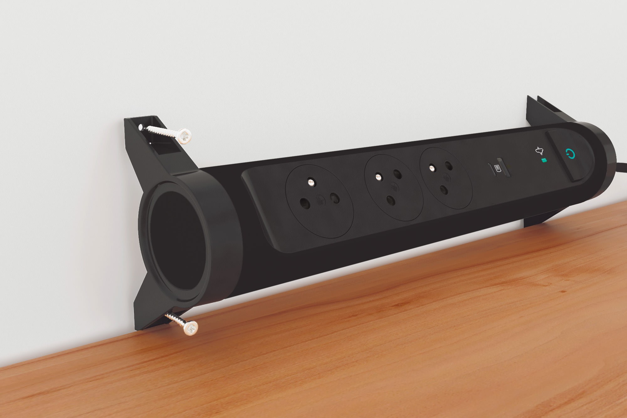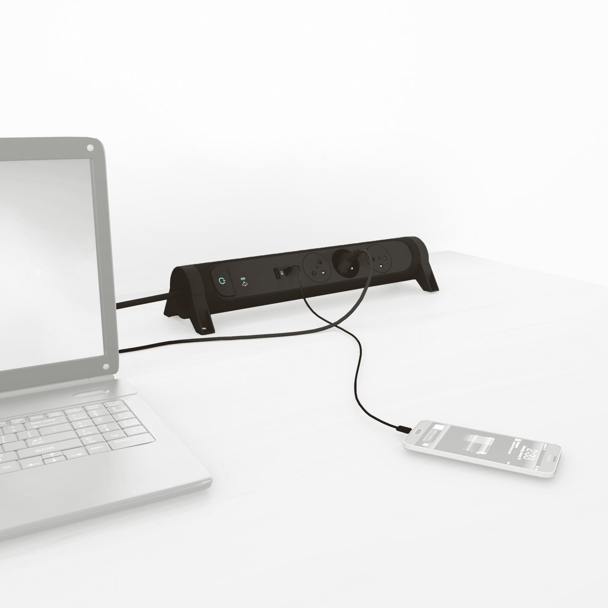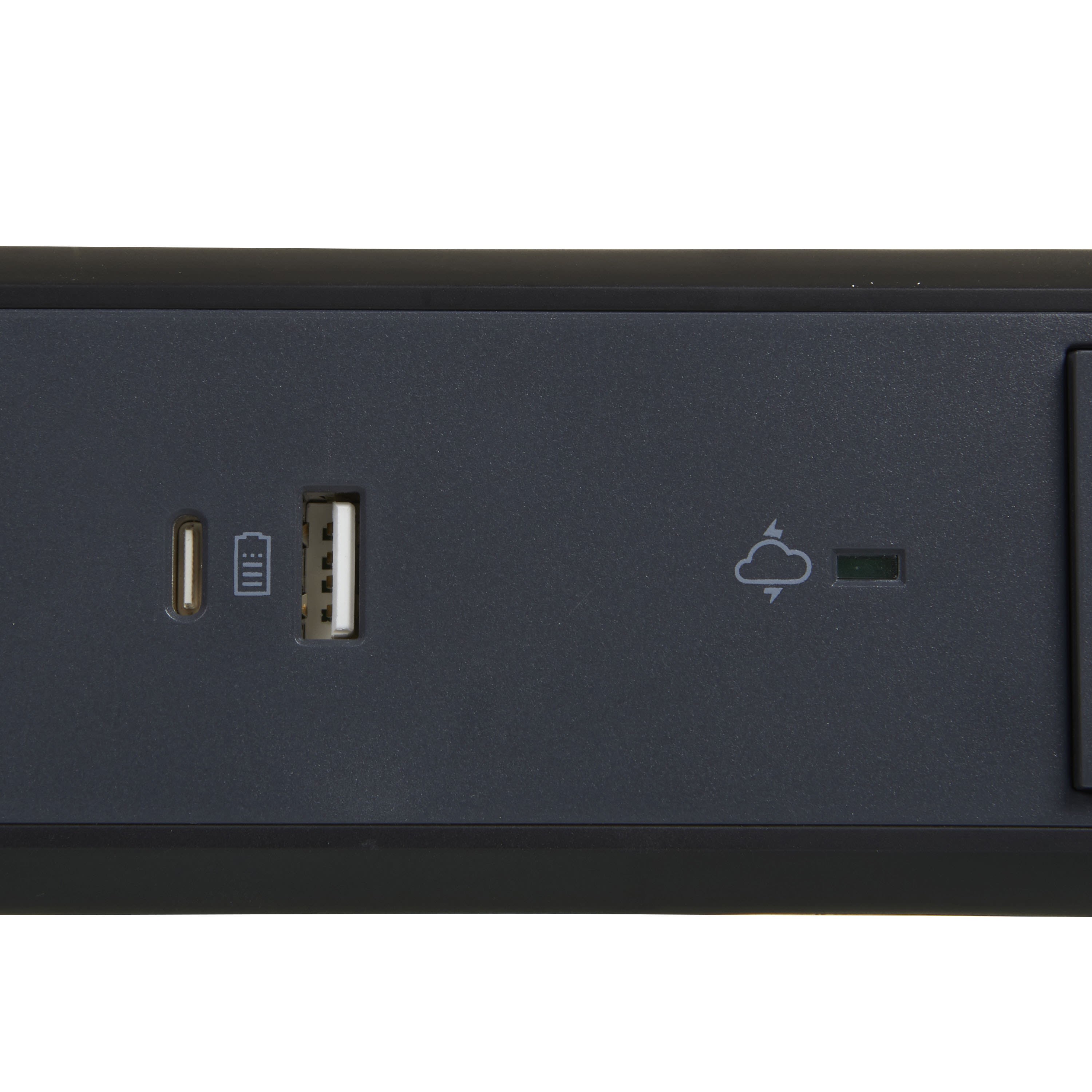 Rallonge multiprise avec 3 prises de courant 2P+T Surface (affleurantes) : 2 prises orientées à 45° et 1 prise à 90° pour brancher un chargeur volumineux sans condamner une autre prise Avec prise USB Type-A + Type-C 3A 15W pour recharger les smartphones, tablettes et autres appareils électroniques 16A 230V 3680W maximum - Avec éclips de protection pour protection enfant Parafoudre intégré avec voyant :- voyant vert, la multiprise est protégée- voyant éteint, le parafoudre n'est plus fonctionnel, néanmoins, les prises sont alimentées - Si la fonction parafoudre est nécessaire, il faut dans ce cas changer la multiprise Cordon d'alimentation longueur 1,5m 3G 1mm² avec fiche 2P+T - Finition noir et anthracite