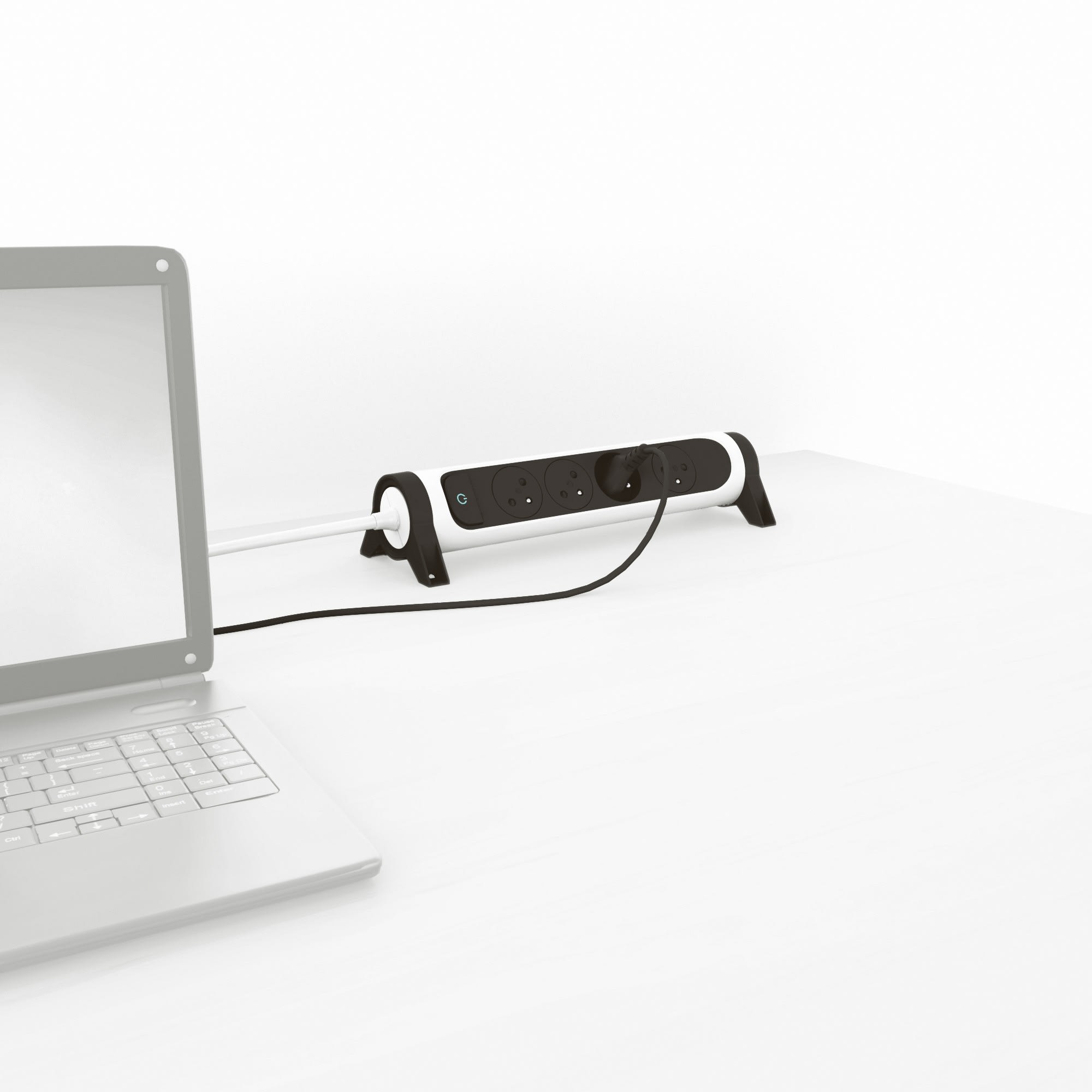 Rallonge multiprise avec 4 prises de courant 2P+T Surface (affleurantes) : 3 prises orientées à 45° et 1 prise à 90° pour brancher un chargeur volumineux sans condamner une autre prise 16A 230V 3680W - Avec éclips de protection pour protection enfant Interrupteur ON/OFF lumineux de couleur bleu - Cordon d'alimentation longueur 2m 3G 1,5mm² avec fiche 2P+T Cordon d'alimentation longueur 1,5m 3G 1mm² avec fiche 2P+T Finition blanc et noir/anthracite