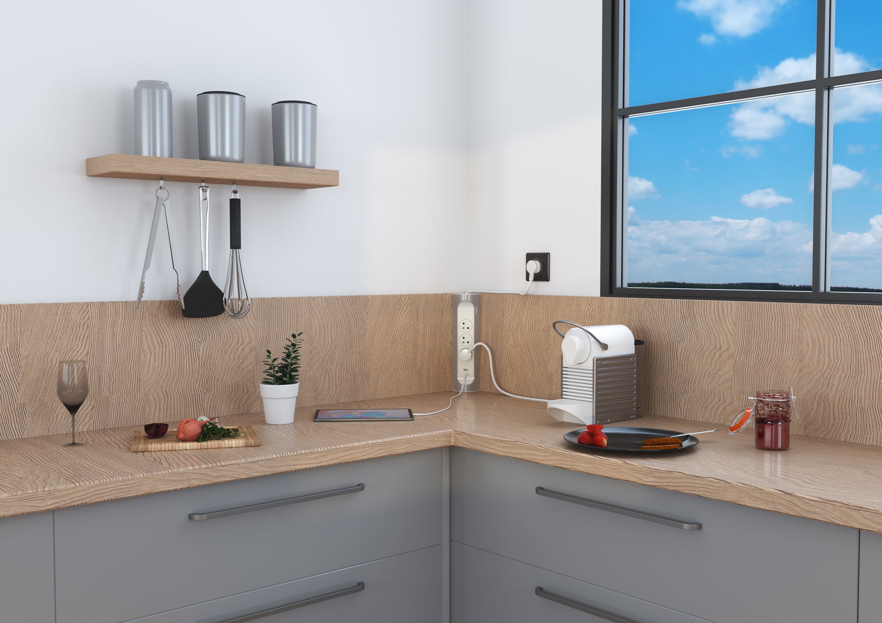 Rallonge multiprise avec 3 prises de courant 2P+T Surface (affleurantes) orientées à 45° Avec prise USB Type-A + Type-C 3A 15W pour recharger les smartphones, tablettes et autres appareils électroniques 16A 230V 3680W maximum - Avec éclips de protection pour protection enfant Installation dans angle à l'horizontale ou à la verticale Cordon d'alimentation longueur 1m 3G 1,5mm² avec fiche 2P+T - Finition aluminium/blanc