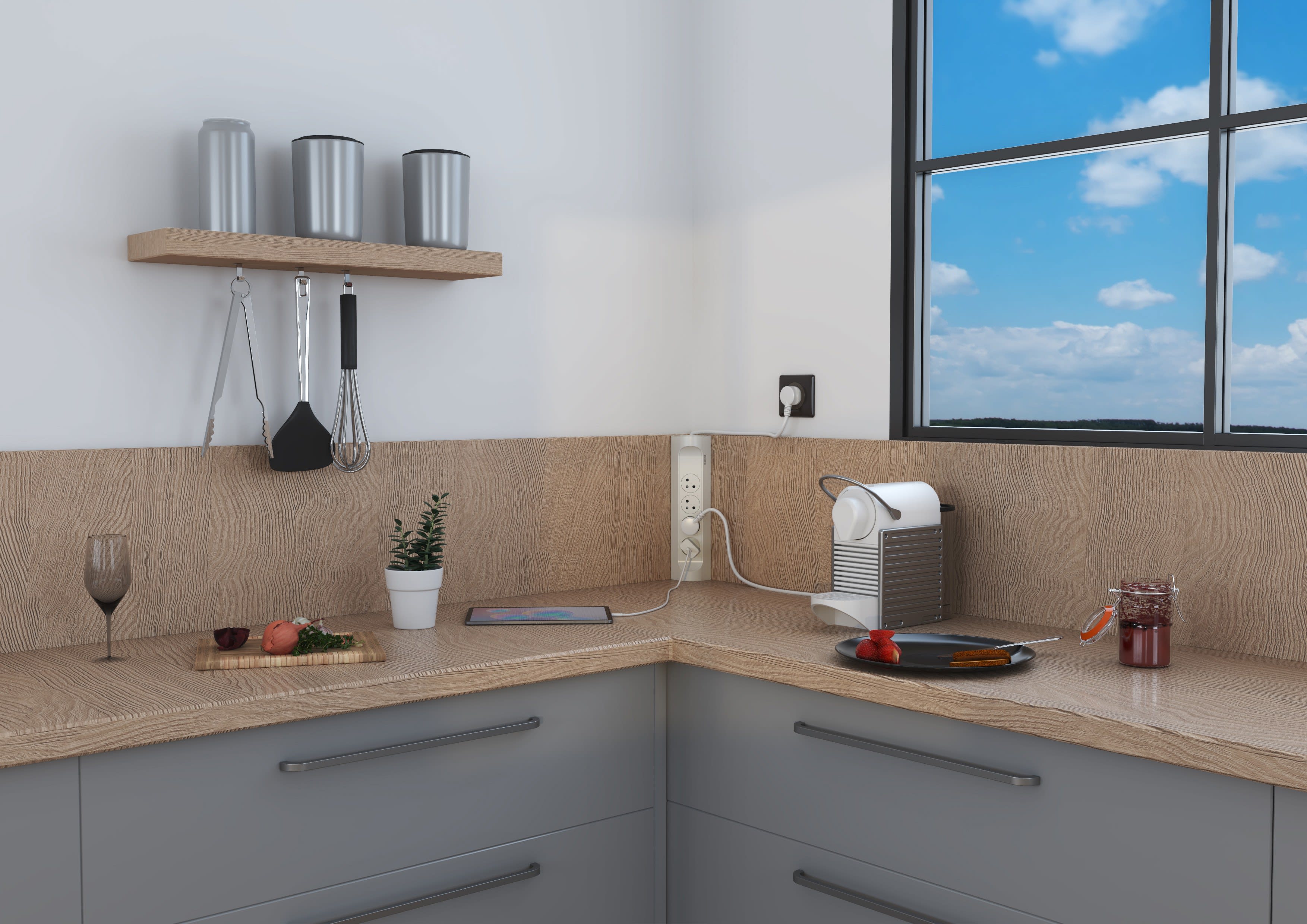 Rallonge multiprise d'angle avec partie arrière amovible pour la gestion des câbles, équipée de 4 prises de courant Surface orientées à 45° 16A 230V et 1 cordon blanc de longueur 1m - blanc à fixer idéalement dans l'espace cuisine ou bureau