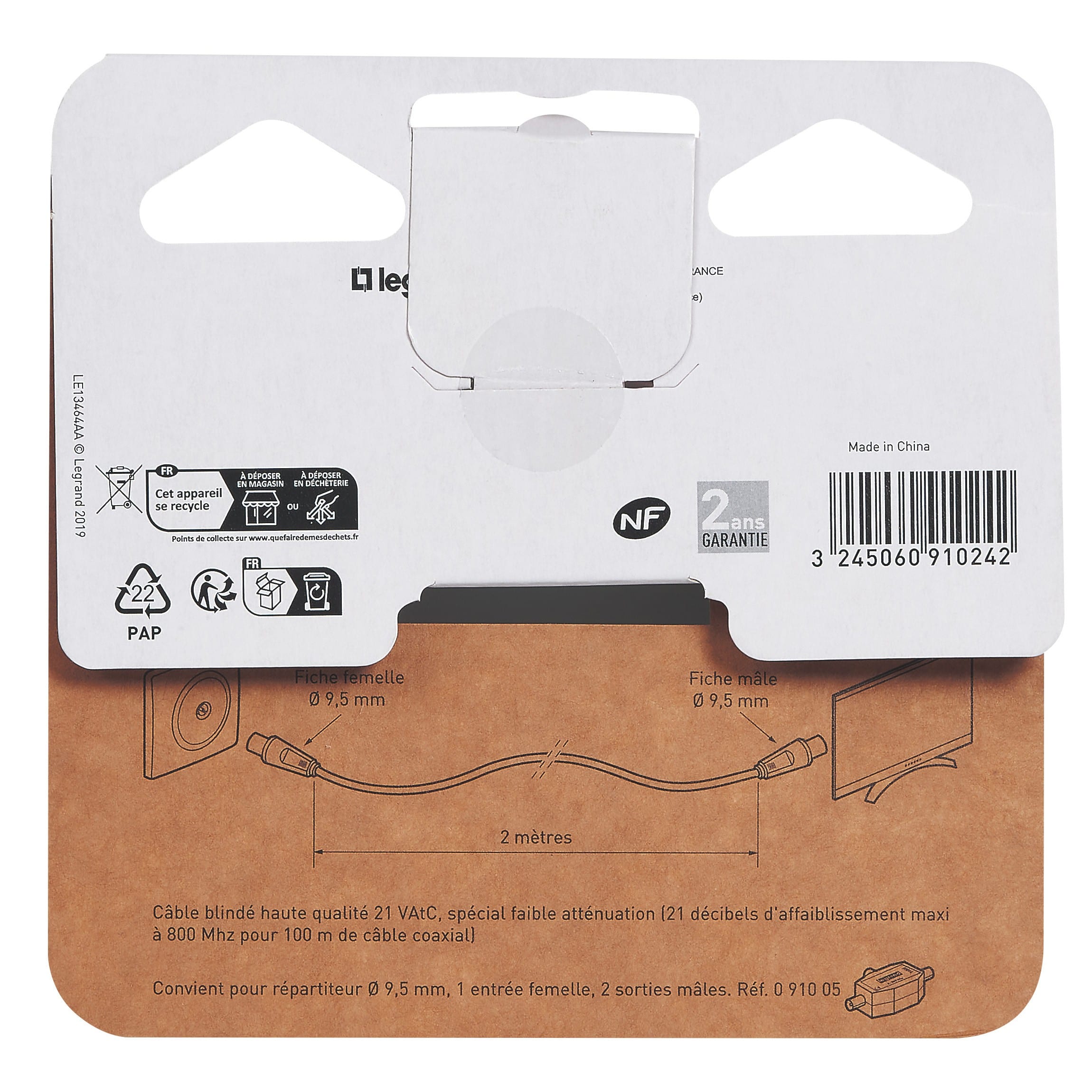 Legrand - Rallonge télévision 1 fiche femelle et 1 fiche mâle Ø9,52mm - longueur 2m -blanc - 091024