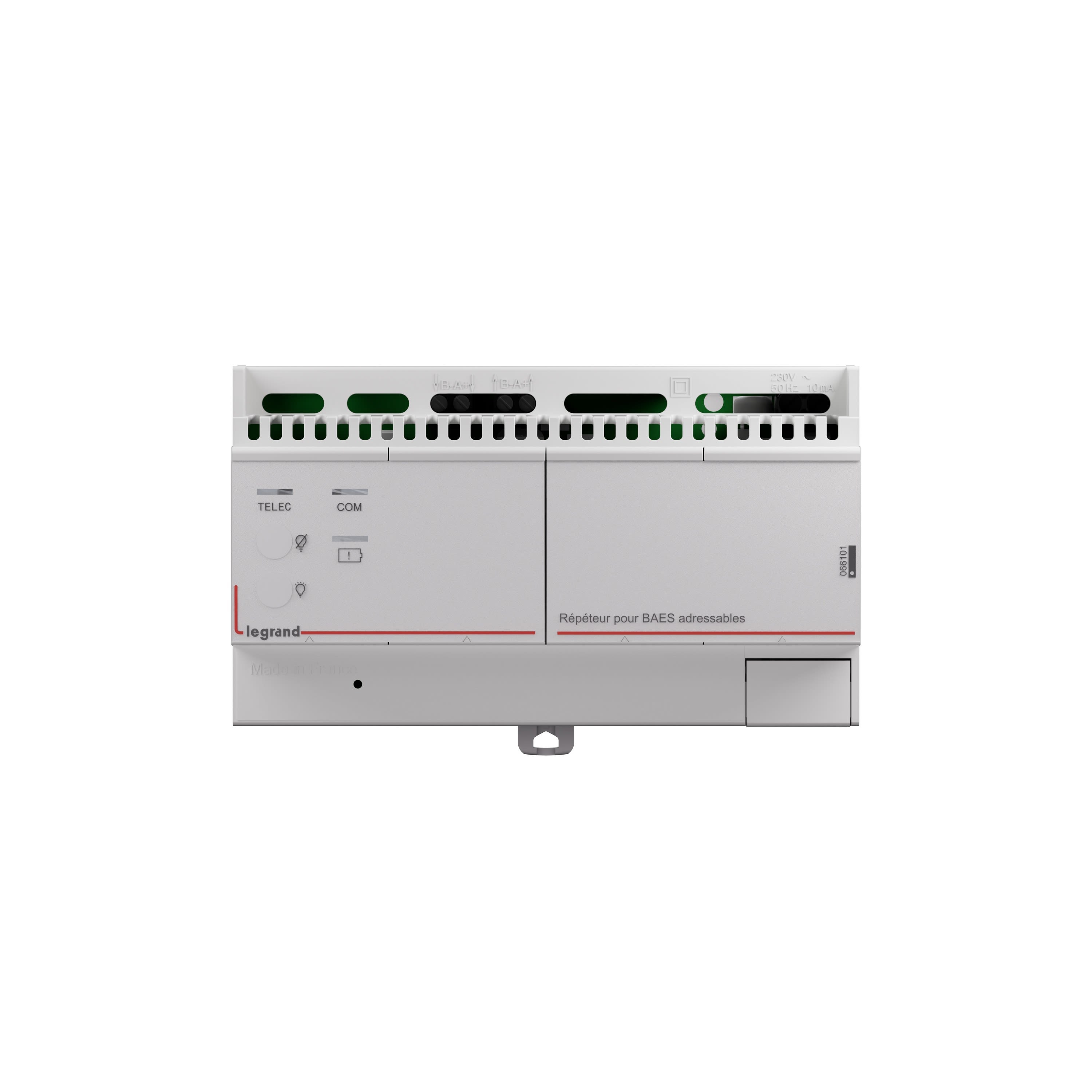 Répéteur pour BAES Adressables Capacité 250 blocs et 700m de ligne de bus Commandes d'extinction (mise au repos des blocs secteur absent) et d'allumage accessibles en face avant Montage sur rail DIN Largeur 8 modules de 17,5 mm