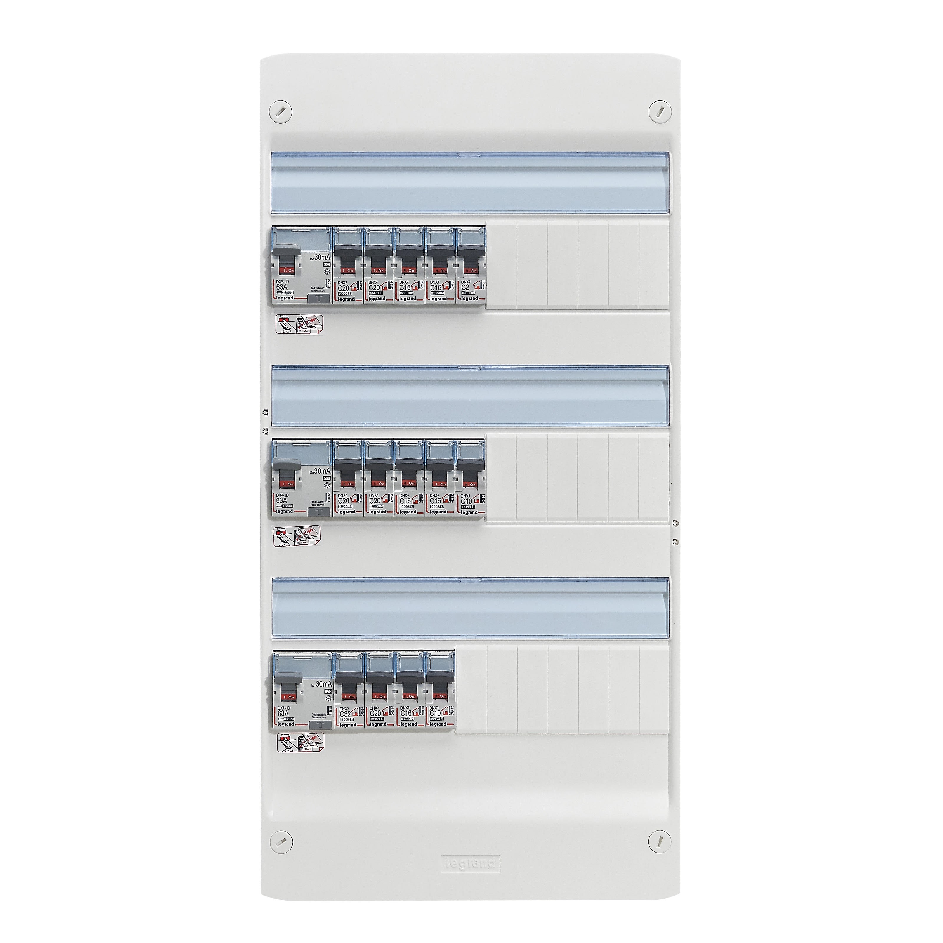 Tableau électrique Evolué (label Promotelec) DRIVIA sans porte 3 rangées de 13 modules équipé et précâblé pour logement T4 avec 3 inters différentiels (2x63A Type AC et 63A Type A) et 15 disjoncteurs (1x32A, 5x20A, 5x16A, 3x10A et 1x2A)