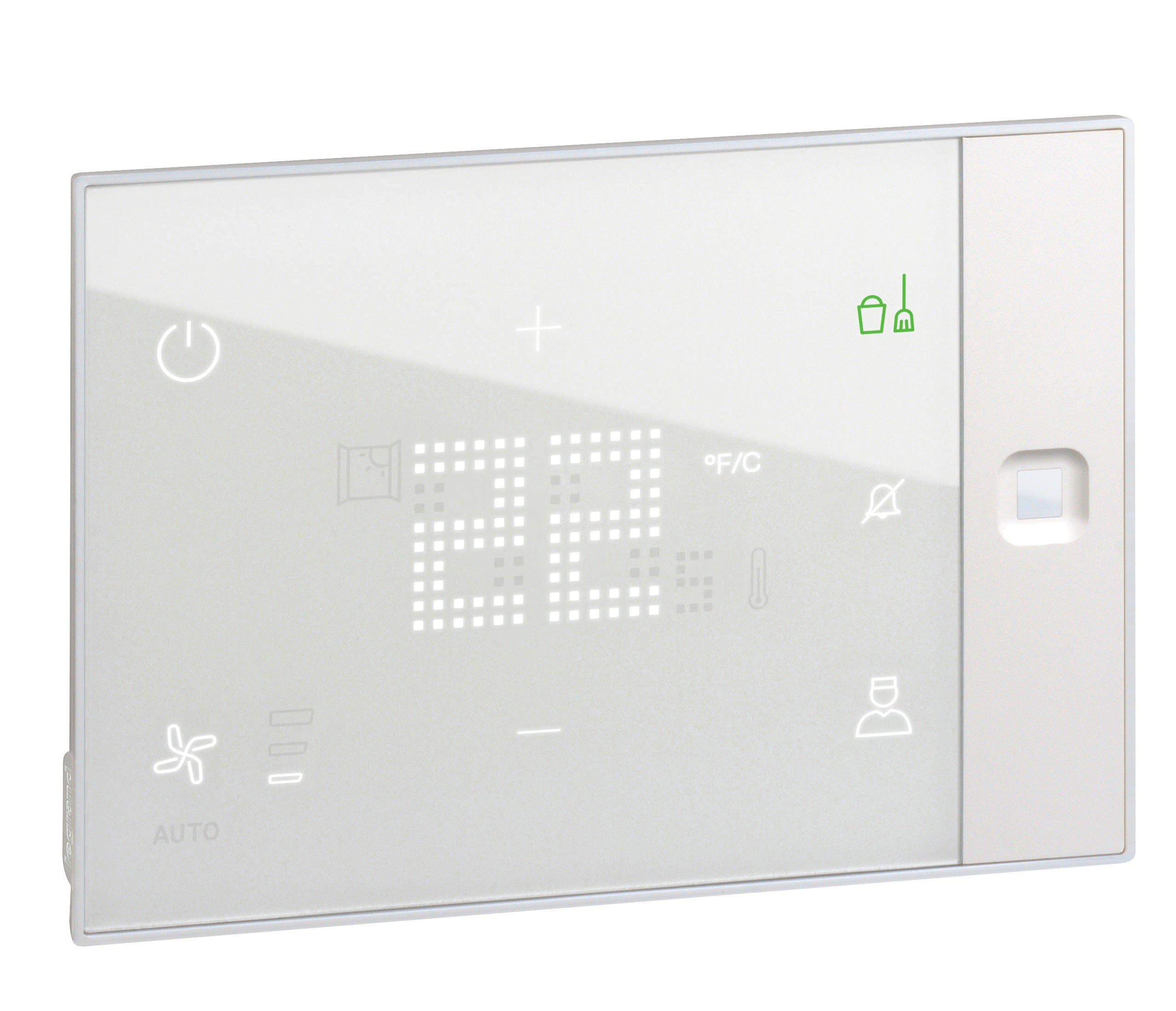 Le thermostat est dédié à l'hôtel et peut être utilisé sur les installations de chauffage et de climatisation Il permet de visualiser et de contrôler la température de consigne, la vitesse de ventilation et la commutation de la protection thermique L'écran affiche la température ambiante ou la température de consigne Un capteur de proximité peut détecter une occupation à l'intérieur de la pièce et activer la LED de rétroéclairage La personnalisation peut être effectuée en choisissant les couleurs, en ajoutant du texte sous Icônes et en ajoutant 3 boutons personnalisables pour activer les scènes