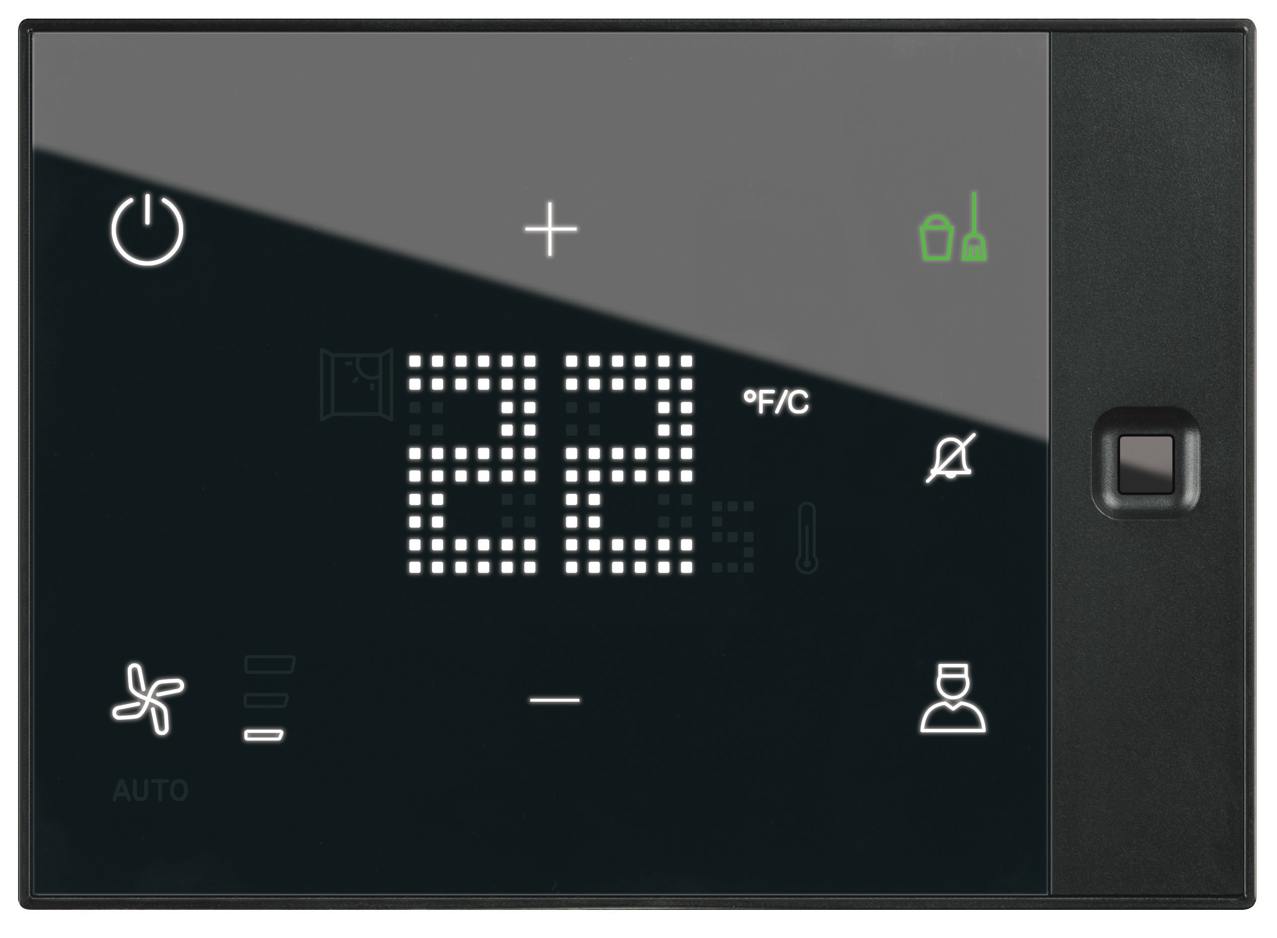 Le thermostat est dédié à l'hôtel et peut être utilisé sur les installations de chauffage et de climatisation Il permet de visualiser et de contrôler la température de consigne, la vitesse de ventilation et la commutation de la protection thermique L'écran affiche la température ambiante ou la température de consigne Un capteur de proximité peut détecter une occupation à l'intérieur de la pièce et activer la LED de rétroéclairage La personnalisation peut être effectuée en choisissant les couleurs, en ajoutant du texte sous Icônes et en ajoutant 3 boutons personnalisables pour activer les scènes