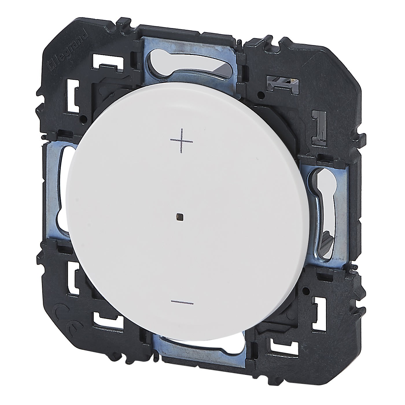 Permet de commander les lampes 150W maximum de type dimmable, LEDs, halogènes, fluocompact du marché Avec réglage butée haute et basse d'éclairage Câblage 3 fils avec Neutre Encombrement réduit : compatible avec boîte profondeur 30mm Blanc - À équiper d'une plaque