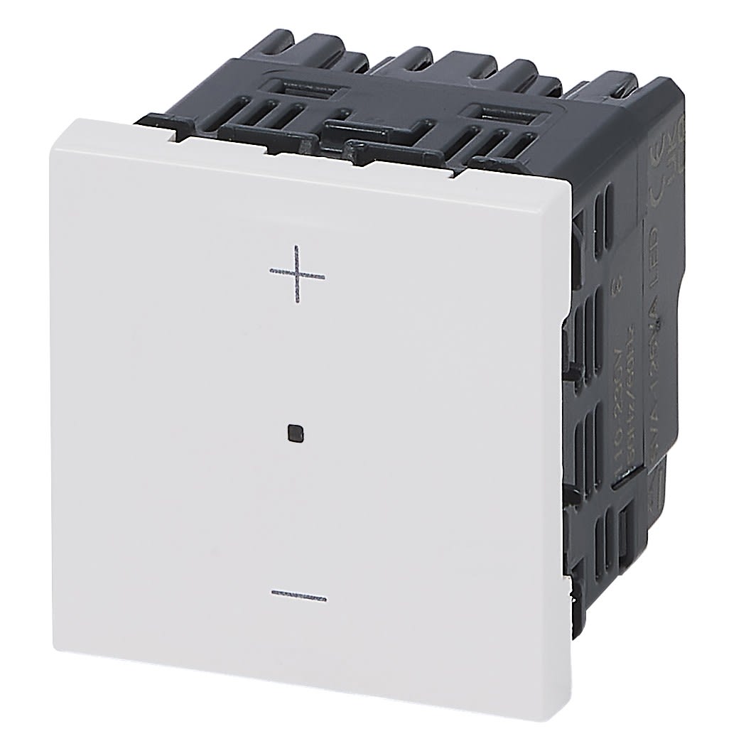 Permet de commander les lampes 150W maximum de type dimmable, LEDs, halogènes, fluocompact du marché Avec réglage butée haute et basse d'éclairage Câblage 3 fils avec Neutre Encombrement réduit : compatible avec boîte profondeur 30mm 2 modules - Blanc RAL9003 finition brillante