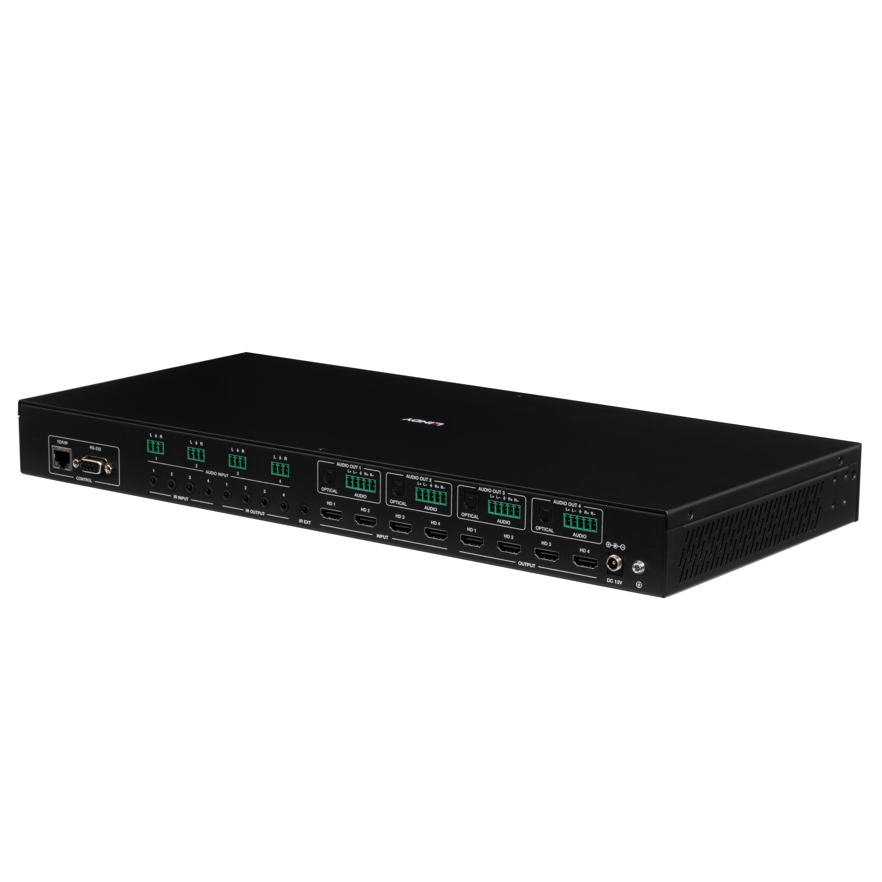 En plus de fournir une fonction professionnelle de commutation de matrice 4x4, cet appareil peut créer des affichages muraux personnalisables dans une variété de dispositions. L'utilisateur dispose ainsi d'une gamme d'options d'affichage flexibles pour son installation et le dispositif peut être utilisé dans une gamme d'environnements spécialisés, notamment les centres de transport, les points de vente et l'hôtellerie. Les ports audio analogiques permettent également l'extraction audio à 2 canaux, pour ajouter un son stéréo immersif au contenu à l'écran.
