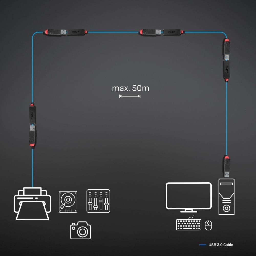 La rallonge active Lindy USB 3.0 Active utilise une électronique embarquée qui permet de déporter un périphérique USB 3.0 de 10m tout en conservant les taux de transferts jusqu' à 5Gbit/s. Avec ses connecteurs USB type A mâle et femelle, cette rallonge permet de déporter des périphériques USB tels que clés USB, smartphones ou tablettes sans perte de vitesse.