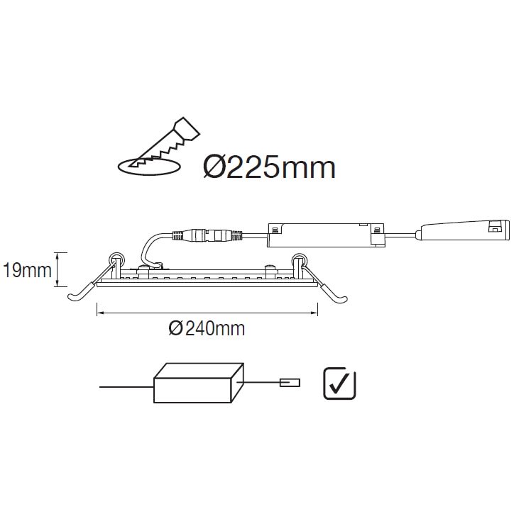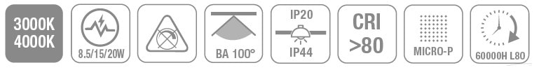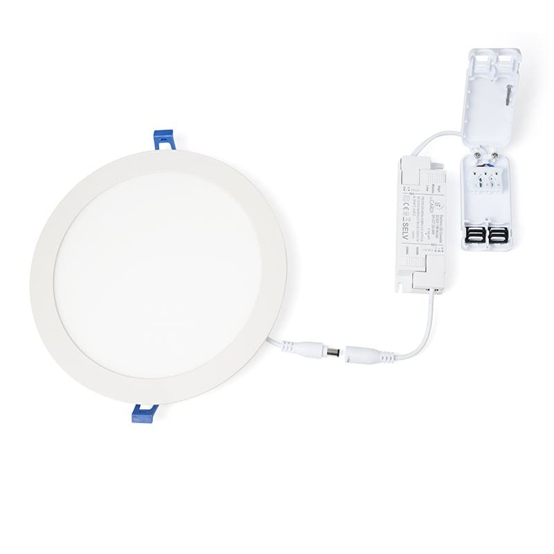 KAI SLIM DOWNLIGHT D240x19 mm 20-15-8.5W 2400-1800-1000lm MULTFLUX 3000/4000K IP44 ENCAST 225 mm 220-240V SDCM4 120lm/W UGR31,IRC>80, IK02, IP44 60 000H L80B10, GARANTIE 5 ANS, CL II, BLANC (RAL9003,Matt) BOITIER AUTO NON DIM