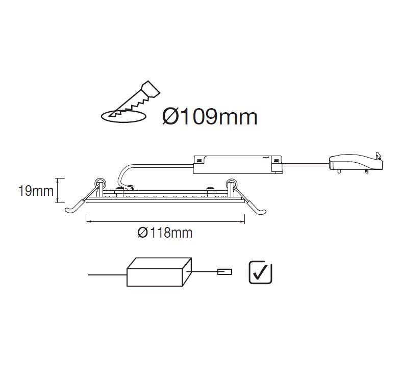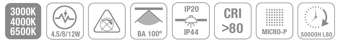 RIO G2 SLIM DOWNLIGHT D118x19 mm 12-8-4.5W 1200-800-450lm MULTFLUX 3000/4000/6500K IP44 ENCASTREMENT 109mm 220-240V SDCM5 EFFICACITE 100lm/W UGR31,IRC>80, IK02, IP44, RG0,50000H L80B10, GARANTIE 5 ANS, CL II, BLANC (RAL9003,Matt) NON DIM
