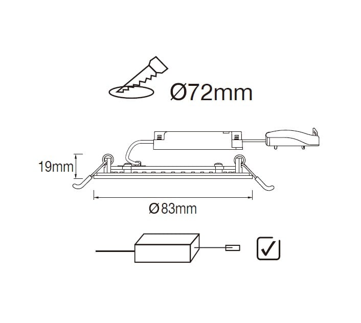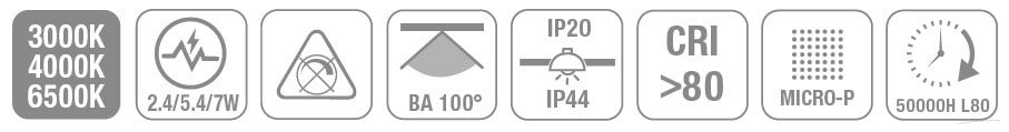 RIO G2 SLIM DOWNLIGHT D83x19 mm 7-5.4-2.4W 700-540-240lm MULTFLUX 3000/4000/6500K IP44 ENCASTREMENT 72mm 220-240V SDCM5 EFFICACITE 100lm/W UGR31,IRC>80, IK02, IP44, RG0, 50000H L80B10, GARANTIE 5 ANS,CL II BLANC (RAL9003,Matt) NON DIM