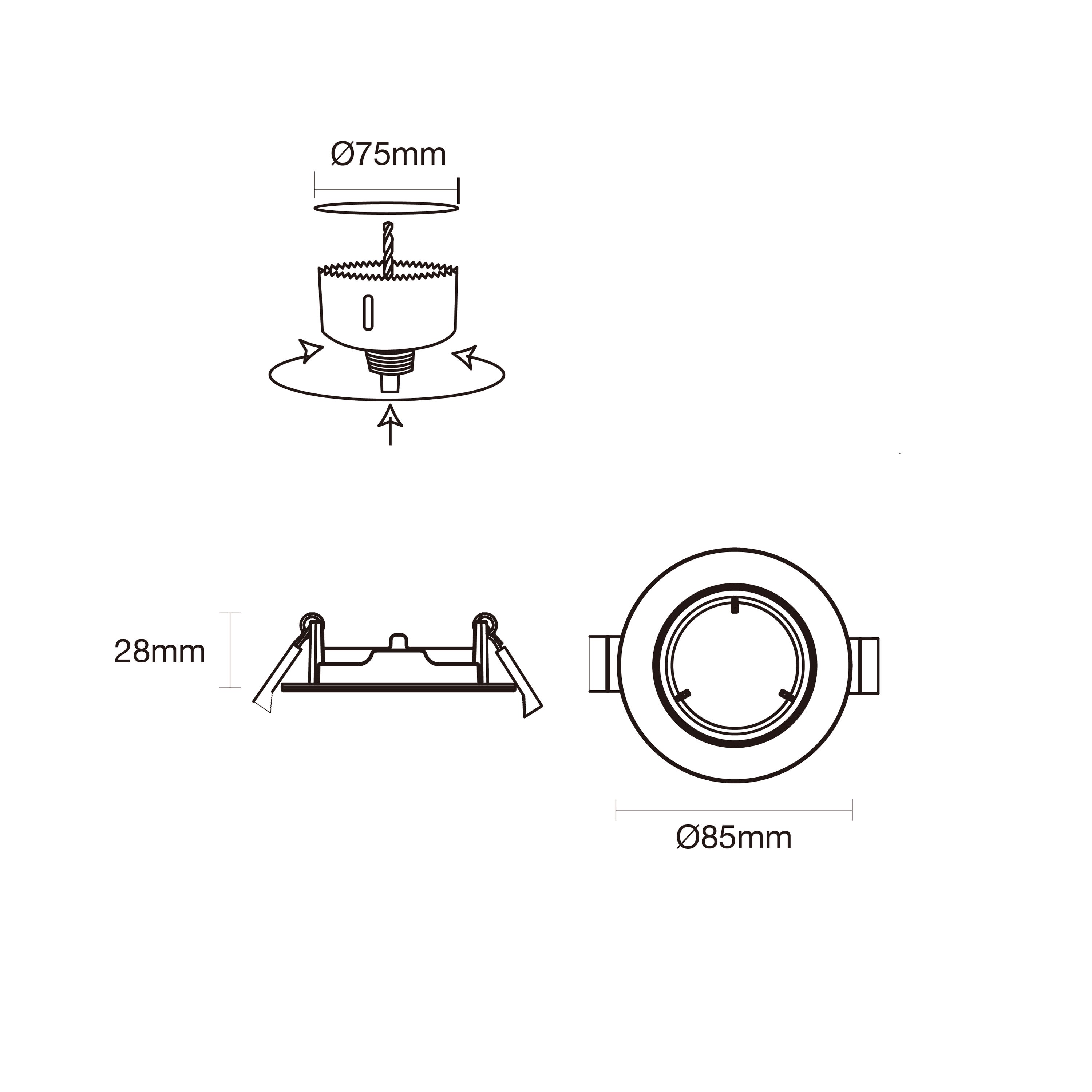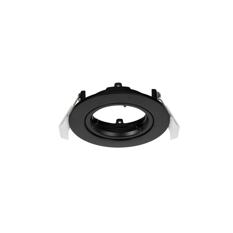 RUNN COLLERETTE ENCASTRABLE PLAFOND - RUNN AVEC DOUILLE GU10 & GU5,3 FINITION NOIR IP20 IK02, dimension: φ85*28mm, découpe: φ75mm, IP20, IK02, corps en aluminium, orientable avec angle d'inclinaison 12°, garantie 3 ans.