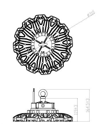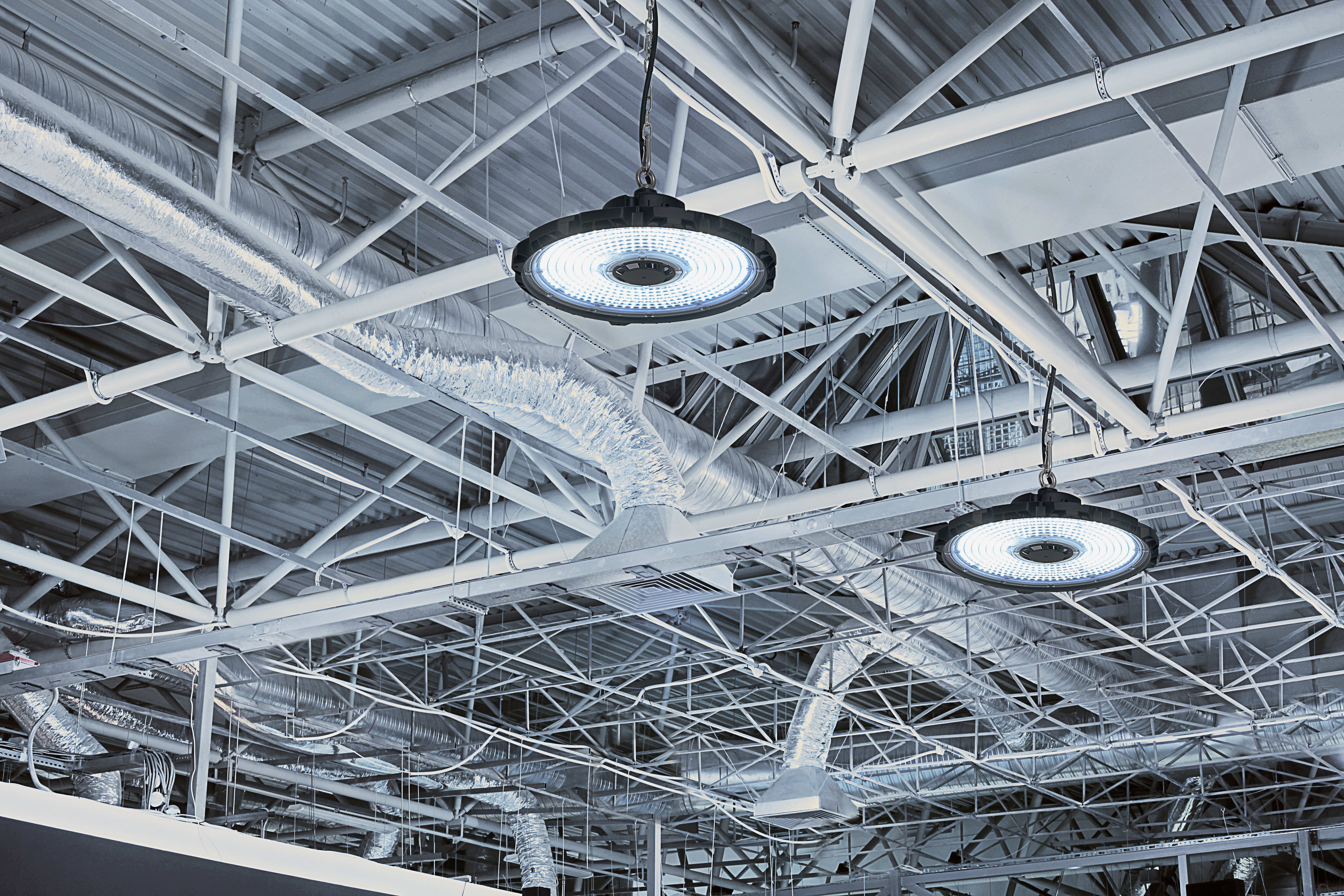 Armature industrielle à haute efficacité lumineuse. Multiflux de 16000lm à 30000lm. Diffuseur en PC, optique à 120°, monté avec 1.5m de câble.