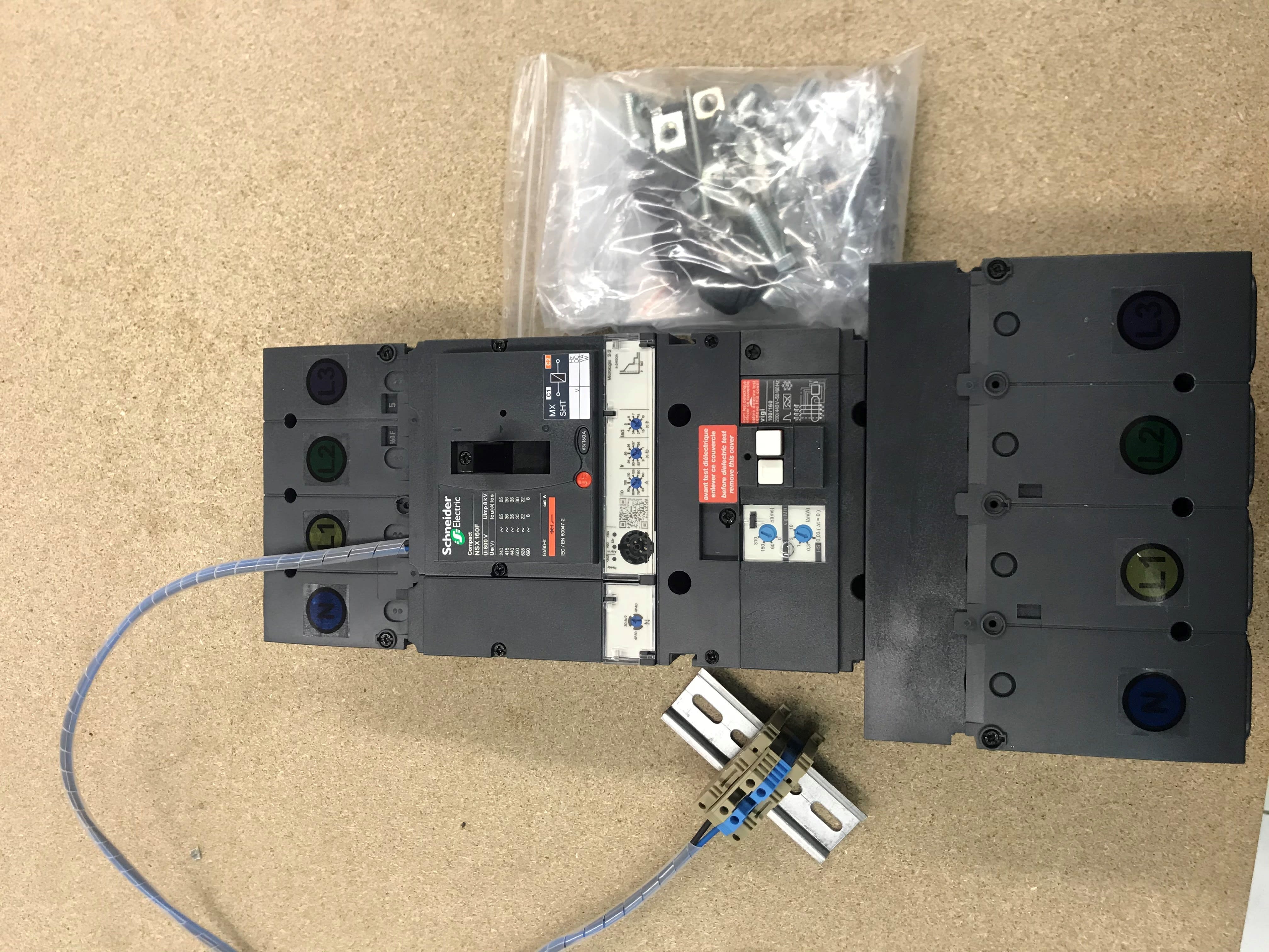 Kit avec 1 Disjoncteur Différentiel NSX250A 1 lot de 4 epanouisseurs (Alu et Cu accepté jusqu’à 240m²), bobine Mx et caches bornes amont et aval