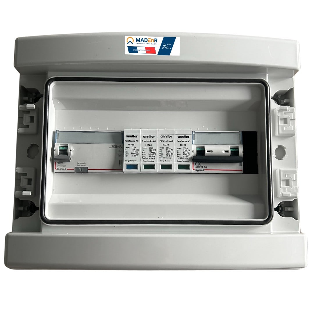 Coffret AC tri 10 kW en Legrand pour 1 onduleur triphasé avec disjoncteur C20 et différentiel 40A 300mA type AC, parafoudre triphasé TT protection intégrée dans un coffret plastique IP65 IK08 conforme conforme UTE C15-712-1