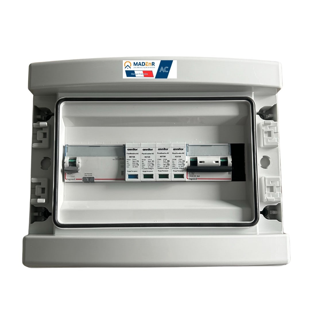 Puissance : 15-17 kWNombre d'onduleurs : 1Disjoncteur : C32Différentiel : 40 A 300 mA ACParafoudre de type II fusibles intégrésTension max de service (L-N) : 275 VTélésignalisation de fin de vieIn = 15 kA ; Imax = 50 kACoffret plastique IP65 IK09 Haute résistance UVUtilisation de -25 à +60°CRésistance aux fils chauds incandescents 750°CHumidité relative : 0-95%