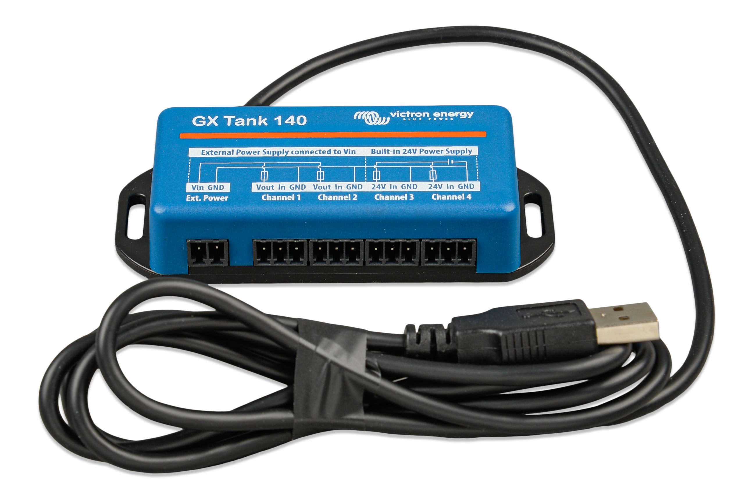 Le GX Tank 140 obtient des mesures de jusqu’à quatre sondes de détection du niveau de réservoir. Il s’agit d’un accessoire pour notre gamme de produits de supervision des systèmes GX, parmi lesquels le Cerbo GX est le modèle le plus habituellement utilisé.Les niveaux de réservoir peuvent être mesurés localement dans le système – voir la capture d’écran – ou bien à distance depuis notre portail VRM Portal.Le GX Tank 140 est compatible avec des sondes de courant (de 4 à 20 mA) ainsi qu’avec des sondes de tension (de 0 à 10 V). La connexion à l’appareil GX se fait via USB, qui est également la source d’alimentation du GX Tank : aucun autre câble d’alimentation n’est nécessaire.Pour le système de détection du réservoir, il faut utiliser un câblage le plus simple possible : deux des quatre entrées fournissent une alimentation de 24 V pour alimenter la sonde. Les deux autres canaux ne requièrent pas d’alimentation électrique grâce à l’énergie issue de la borne et des sorties équipées de fusibles.Des limites supérieures et inférieures peuvent être configurées pour permettre l’utilisation de sondes ne fournissant qu’une partie de l’échelle des valeurs permises, par exemple de 0 à 5 V.Pour obtenir une lecture stable, les mesures sont atténuées par la moyenne. L'atténuation peut être configurée entre 1 et 60 secondes.Des sondes défectueuses et des problèmes de câblage sont détectés : une alarme se déclenchera lorsque les valeurs se trouveront en dehors de limites fixées.Pour les applications marines, l’appareil GX peut transmettre ces valeurs de niveau de réservoir à travers le réseau NMEA 2000 afin qu’elles soient recueillies par d’autres écrans tels qu’un MFD.