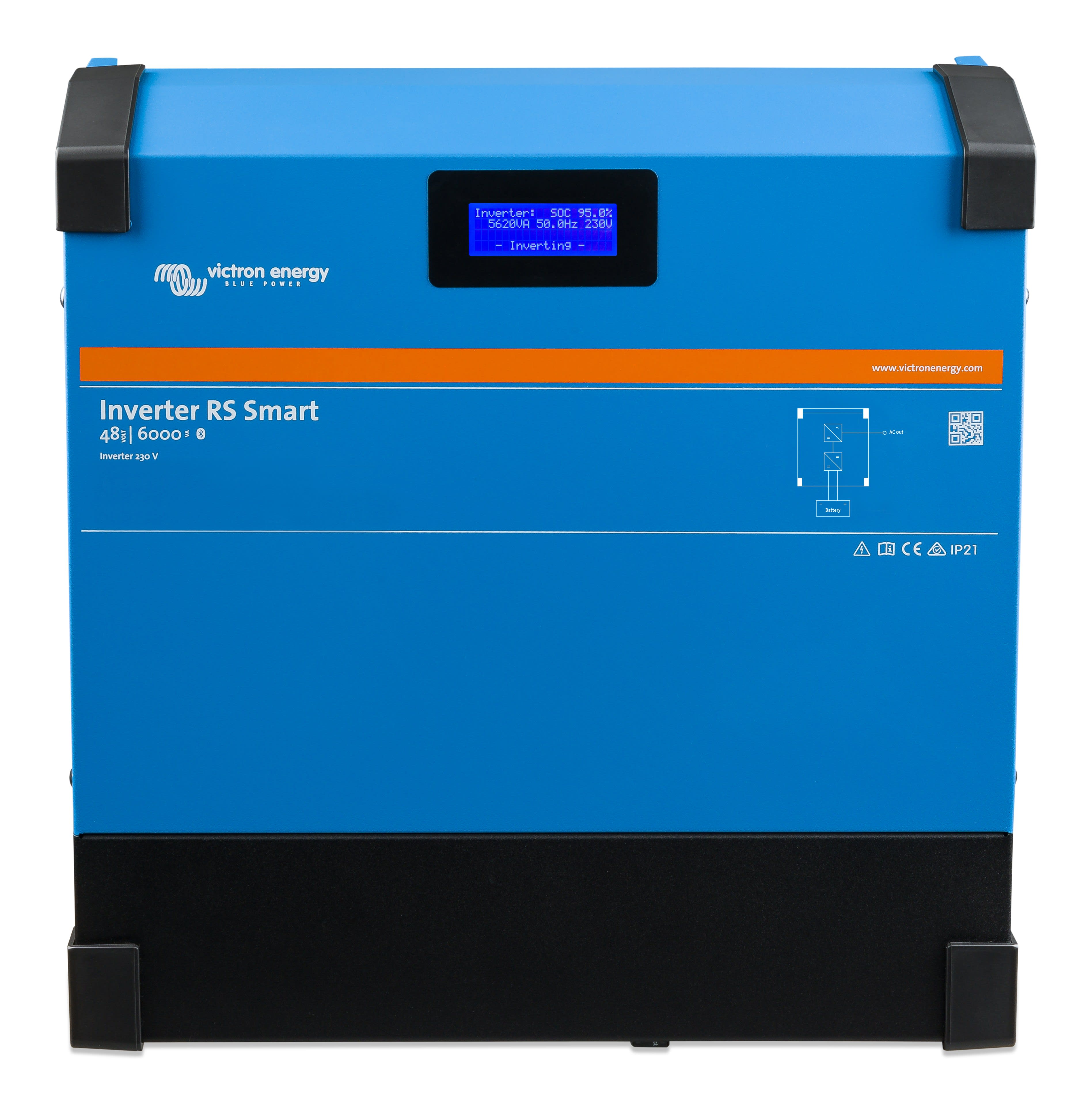 Le RS Smart est un convertisseur puissant de 48 VCC, 6 kVA et 230 VCA. Il présente une conception moderne et une technologie de fréquence élevée. Il ne pèse que 11 kg, et il offre une efficacité excellente, une puissance basse au repos et un fonctionnement très silencieux.Le convertisseur est équipé d'un écran permettant d’afficher ses données détaillées ainsi que celles de la batterie. Ces paramètres peuvent également être transmis pour lecture par Bluetooth à l'application VictronConnect. De plus, le convertisseur dispose d’un port VE.Can pour raccorder un appareil GX afin de superviser le système.